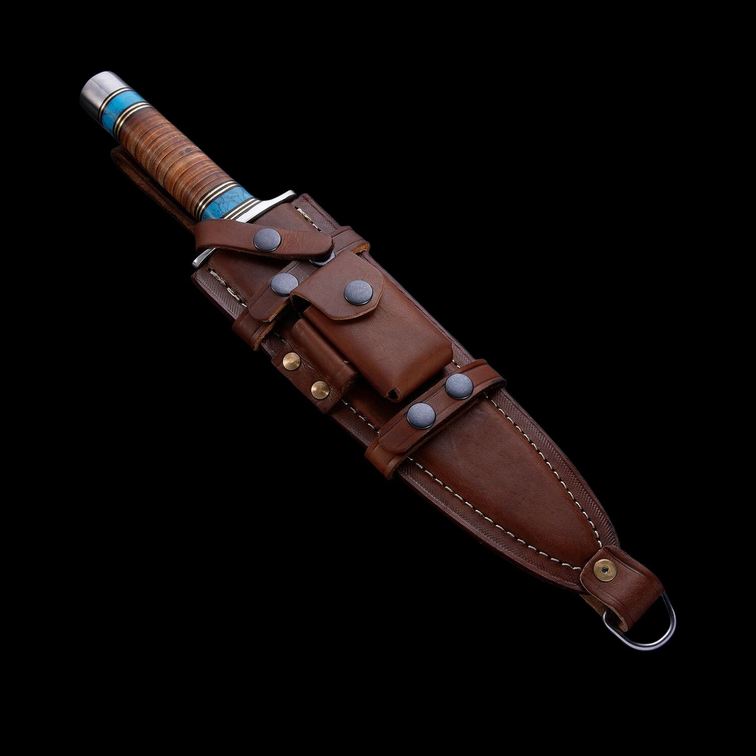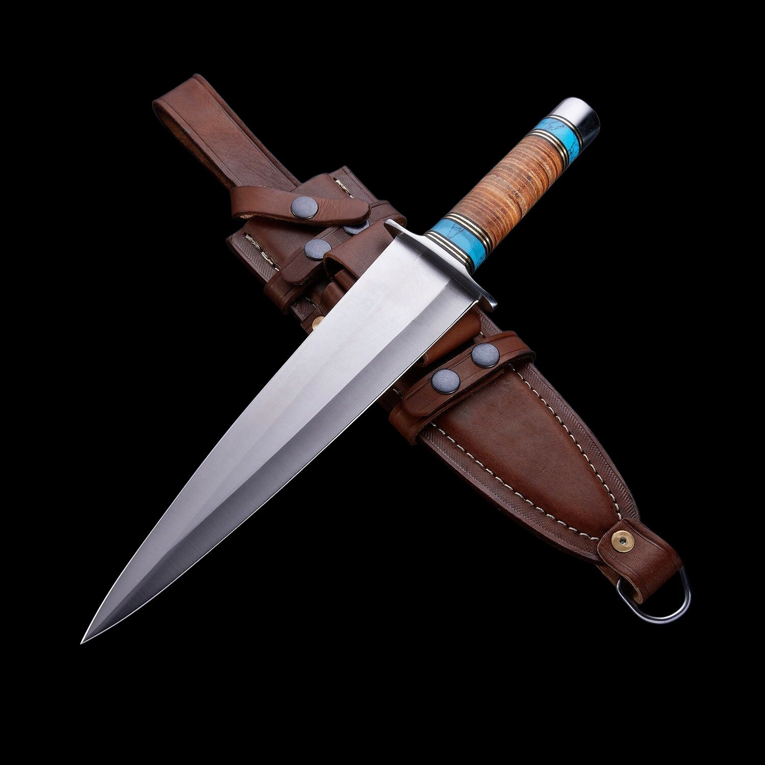 — Handle Material: Steel Guard & Pommel, Turquoise Stone With Stacked Leather, Brass & Black Fiber Spacers