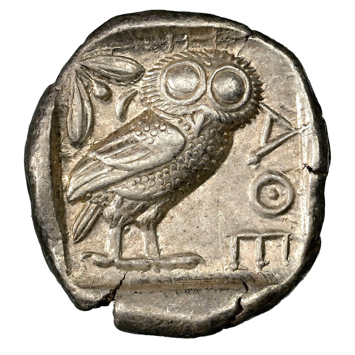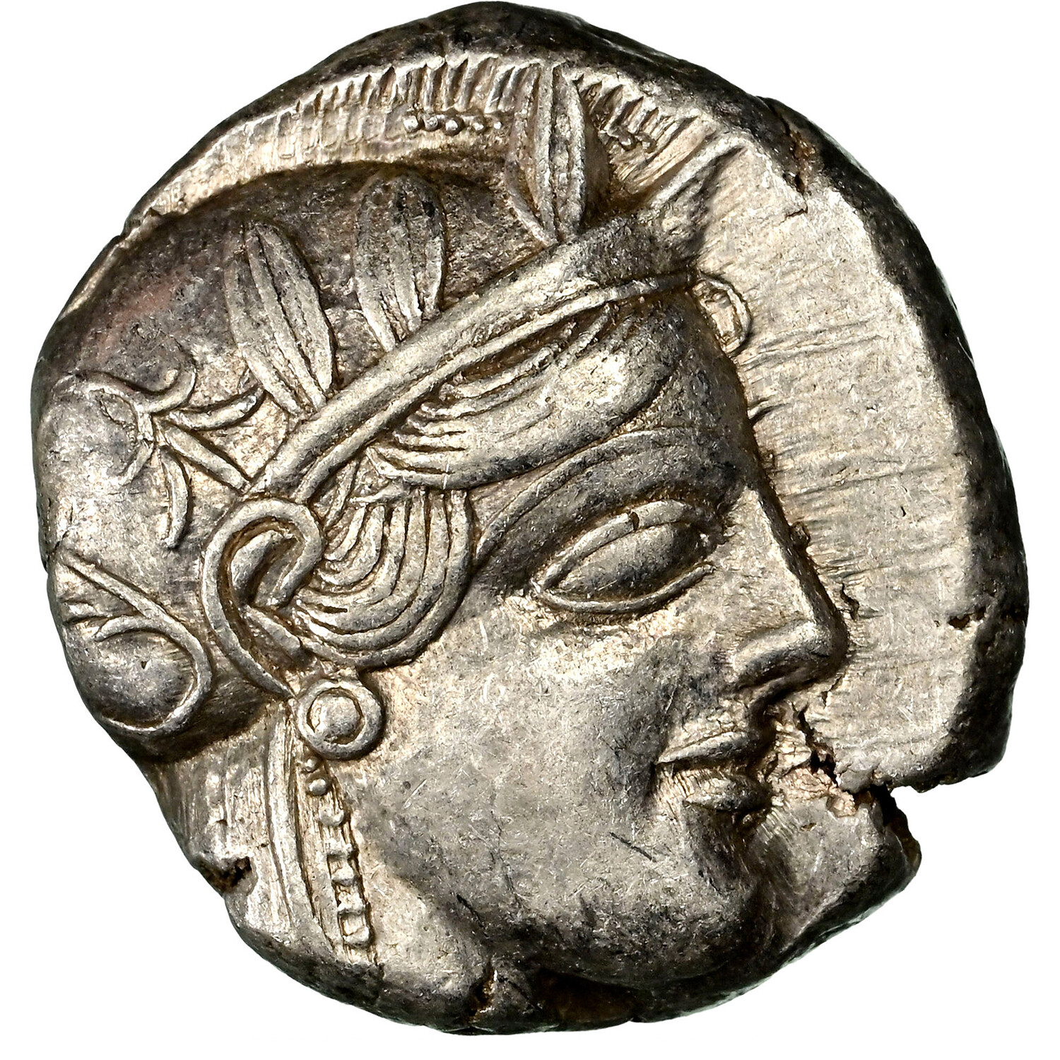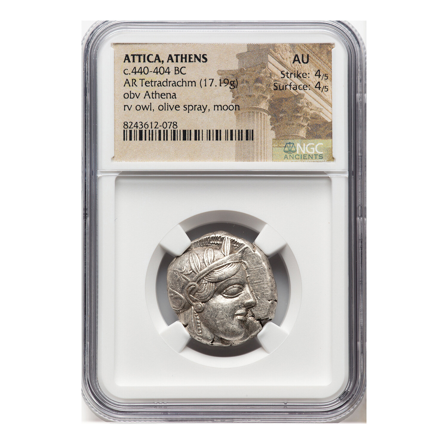 Classical Greece. Athens, Attica, Ancient Greece, c. 440-404 BC. An incredible large silver Tetradrachm, graded About Uncirculated by NGC! The front of the coin depicts the helmeted head of Athena facing right, wearing crested Athenian helmet ornamented with three laurel leaves and vine scroll / The back shows the classical Owl standing right, head facing, closed tail feathers; olive sprig and crescent to left; Greek ΑΘΕ (“ATHENS”) to right, all all within incuse square border. Measures 24mm, weighs 17.19 grams; archival slab measures 3.125" x 2.125" x 0.375”. The NGC label indications “NGC AU 4/5 - 4/5”. Ex Heritage, Texas. *** These coins funded the building of the Acropolis and Parthenon in Athens, as well as funding the Peloponnesian War (431-404 BC) between Athens and Sparta. An extraordinary piece of history! Accompanied by a hand-signed certificate of authenticity which includes all the details, culture, dating, motifs/inscriptions when applicable, historical relevance, and provenance.