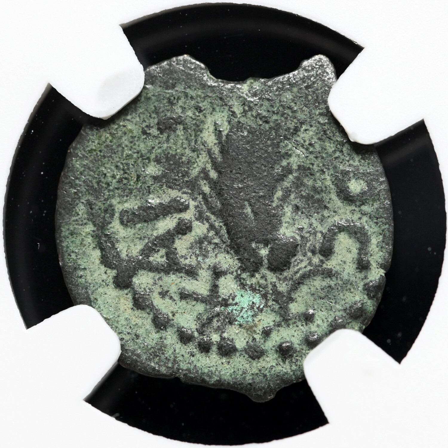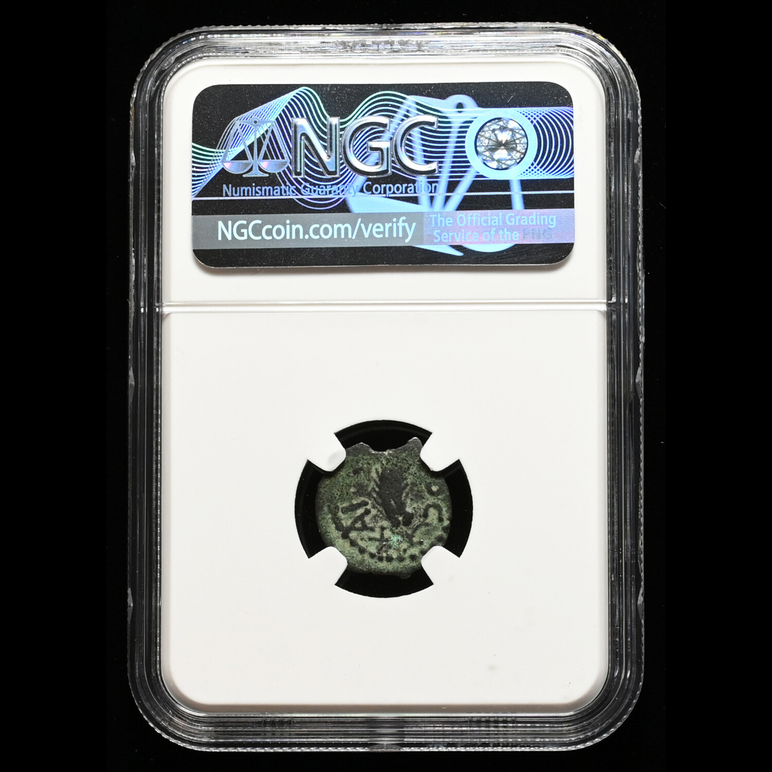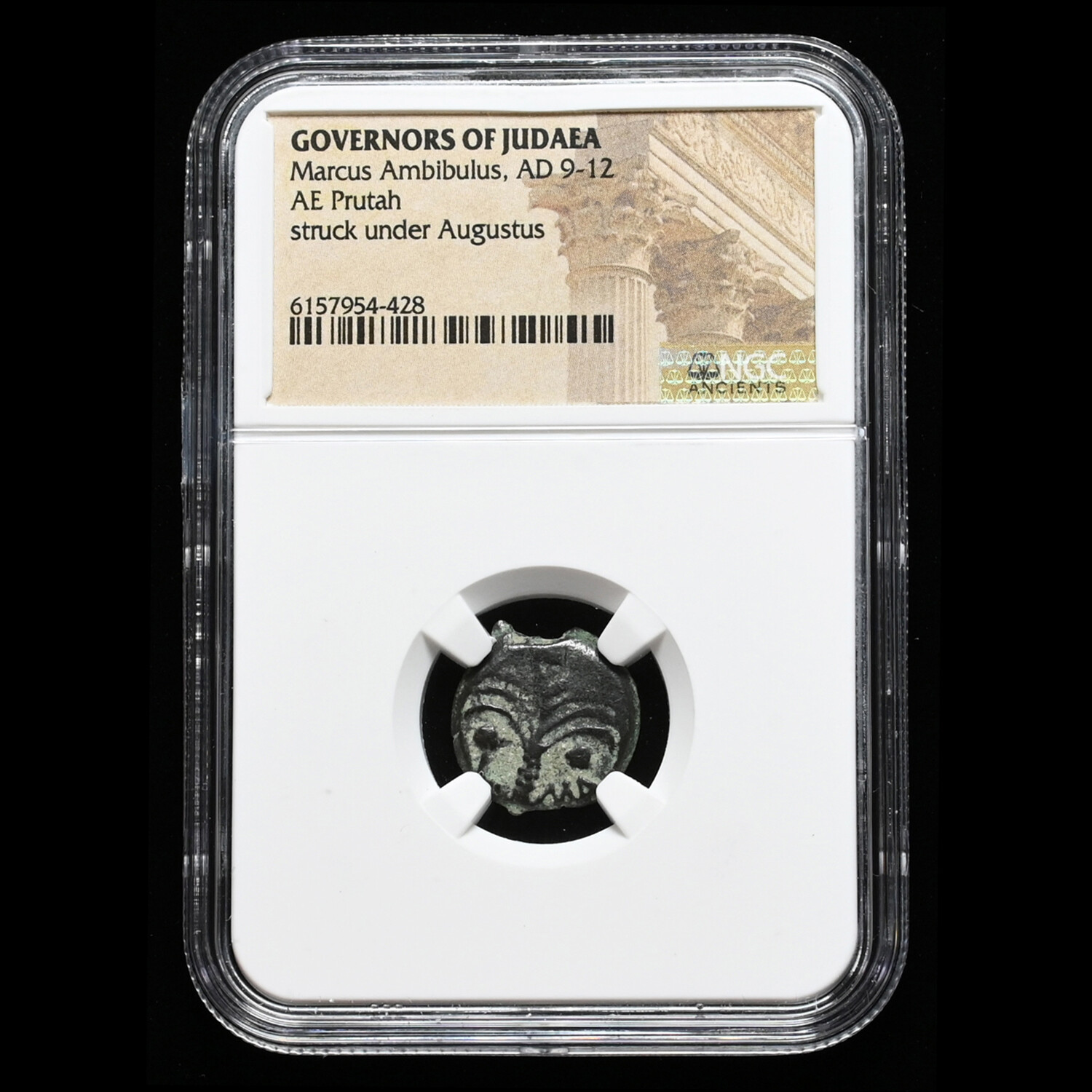 Holy Land, Biblical Judaea, New Testament period. Marcus Ambibulus, Prefect of Judaea 9-12 AD. A member of the Roman elite, he ruled Judaea under Augustus Caesar. Bronze Prutah, struck Year 39 (9 AD). The front depicts an eight-branched palm tree bearing two bunches of dates, date “L-MA” in fields / The back depicts an ear of barley turned to the right, inscription KAICAPOC around. Encapsulated and certified by NGC. Coin measures 16mm diameter; archival slab measures 3.125" x 2.125" x 0.375”. Marcus Ambibulus was discussed by Josephus in “Jewish Antiquities” 18.31. Provenance: Ex De Père, WI collection. Accompanied by a hand-signed certificate of authenticity which includes all the details, culture, dating, motifs/inscriptions when applicable, historical relevance, and provenance.