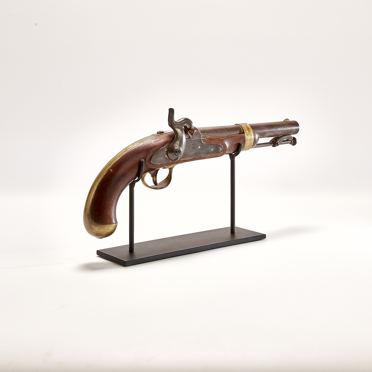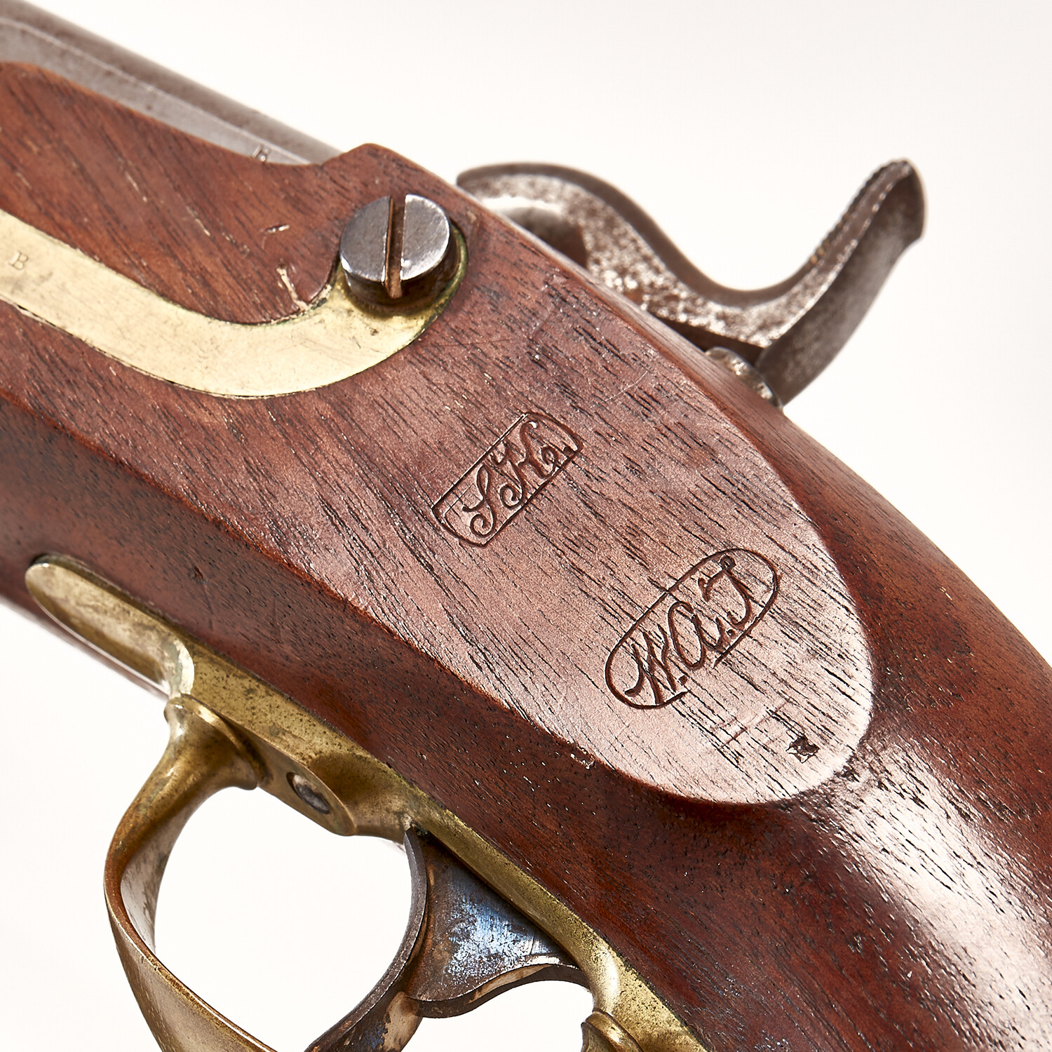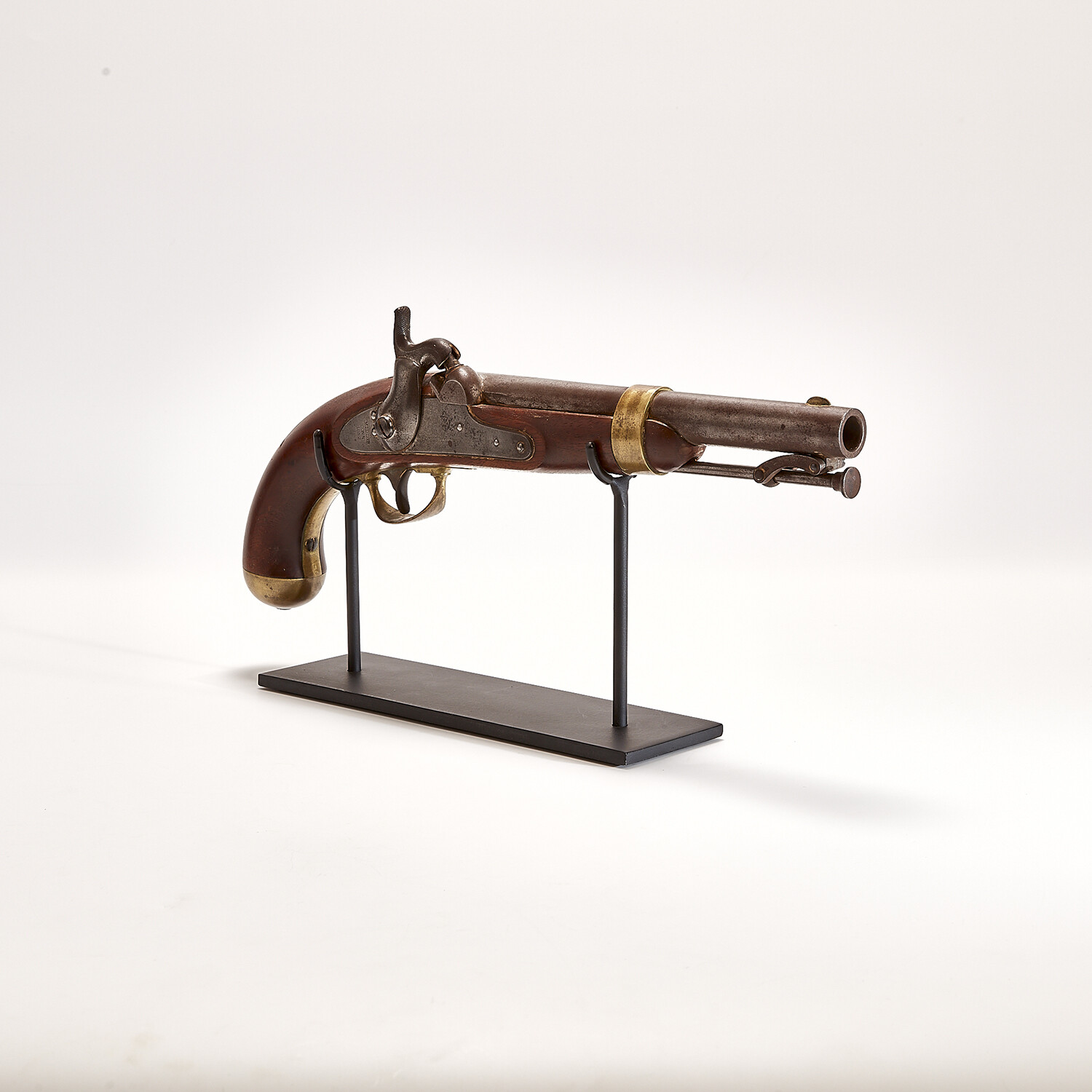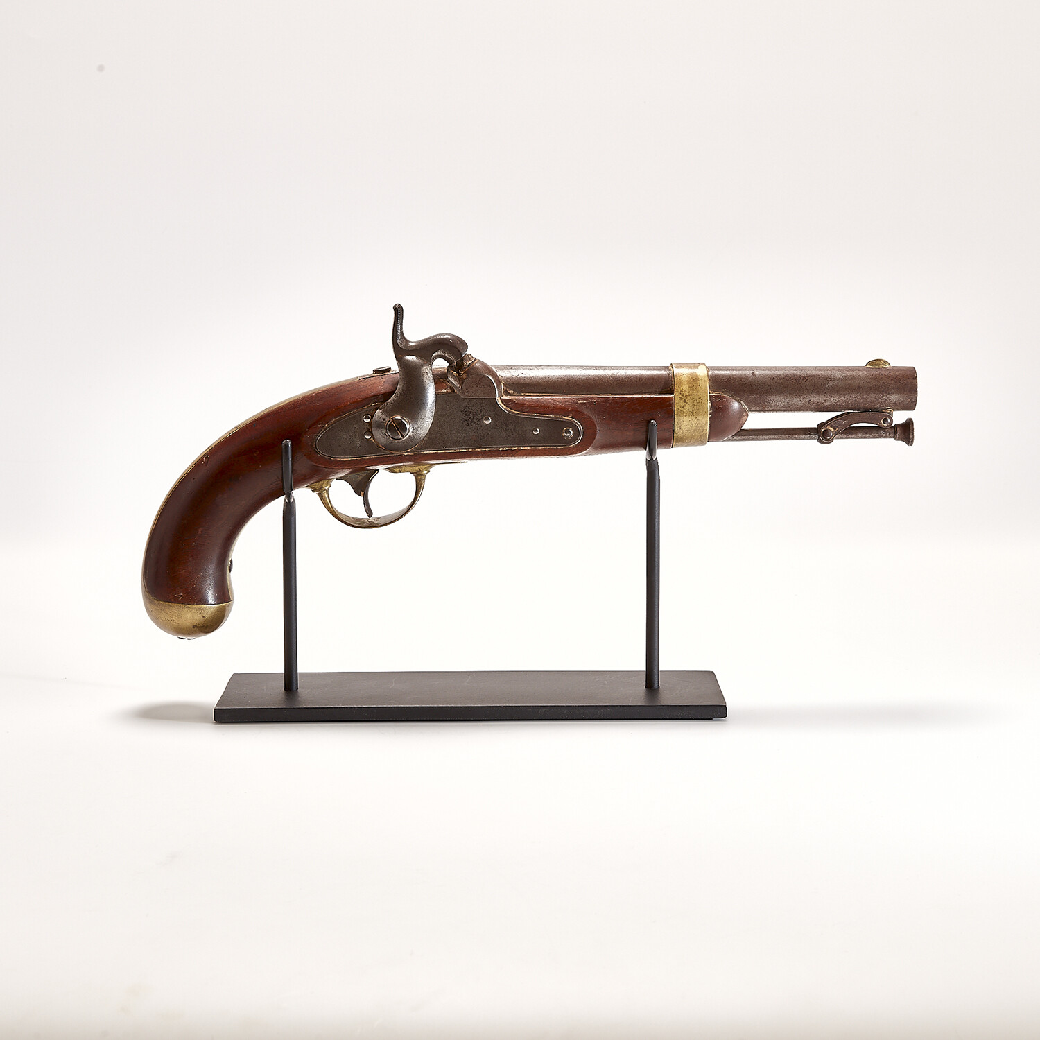 An early American model 1842 US Aston & Company .54 caliber percussion pistol, manufactured in 1852 in Middletown, CT. With brass trigger guard, grip tang, barrel band, hinged metal ram rod, and stamped hammer plate stating “US H ASTON MIDD'TN CONN 1852.” The pistol has a beautifully preserved 8.5” smooth-bore iron barrel. The walnut stock with a visible Cartouche on its left flat and stamped proof marks on top of barrel. Total pistol length 14.25”. The hammer stays at half and full cock with strong action, the metal is polished and extremely well preserved. Ex Middletown, NY collection. With custom metal stand (entire display measures 14.25”L x 2.75”W x 7.5”H). This is an antique, and not warranted safe to shoot without restoration and the aid of a skilled professional. An attractive and historic display-piece! Accompanied by a hand-signed certificate of authenticity which includes all the details, culture, dating, motifs/inscriptions when applicable, historical relevance, and provenance.