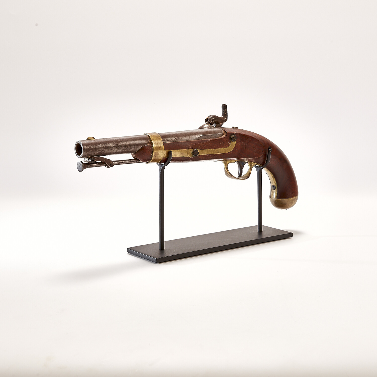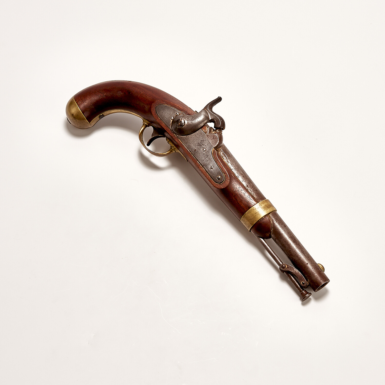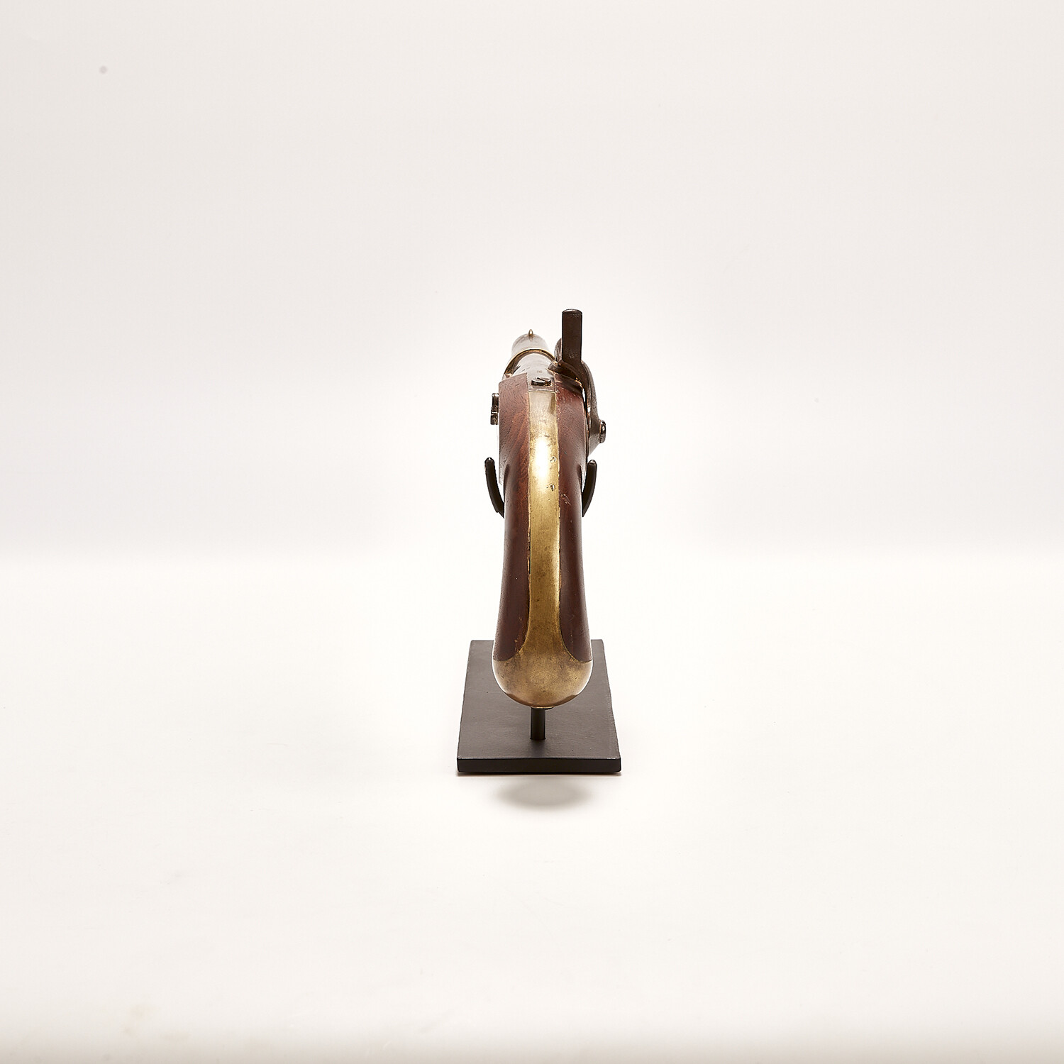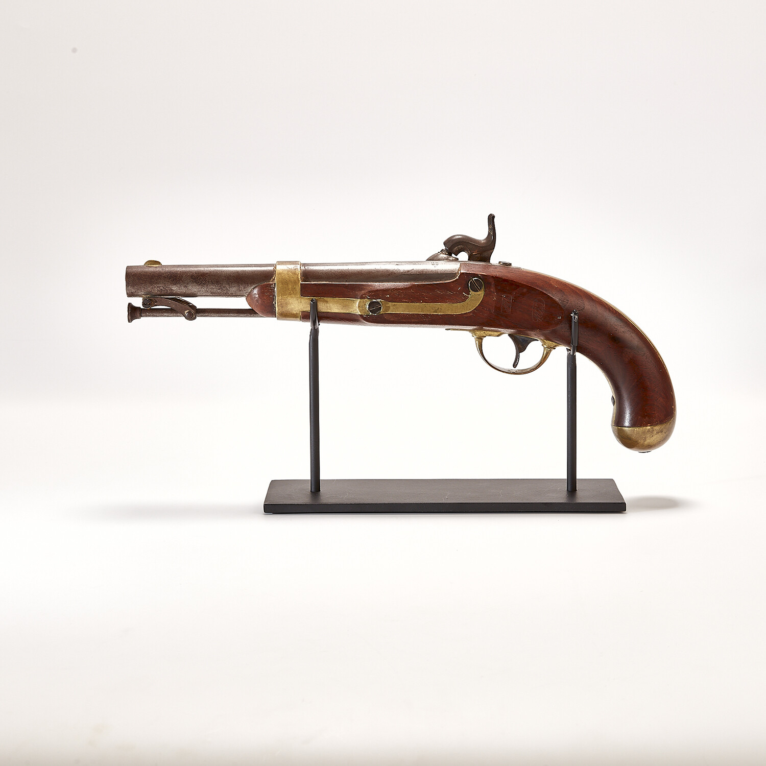 An early American model 1842 US Aston & Company .54 caliber percussion pistol, manufactured in 1852 in Middletown, CT. With brass trigger guard, grip tang, barrel band, hinged metal ram rod, and stamped hammer plate stating “US H ASTON MIDD'TN CONN 1852.” The pistol has a beautifully preserved 8.5” smooth-bore iron barrel. The walnut stock with a visible Cartouche on its left flat and stamped proof marks on top of barrel. Total pistol length 14.25”. The hammer stays at half and full cock with strong action, the metal is polished and extremely well preserved. Ex Middletown, NY collection. With custom metal stand (entire display measures 14.25”L x 2.75”W x 7.5”H). This is an antique, and not warranted safe to shoot without restoration and the aid of a skilled professional. An attractive and historic display-piece! Accompanied by a hand-signed certificate of authenticity which includes all the details, culture, dating, motifs/inscriptions when applicable, historical relevance, and provenance.
