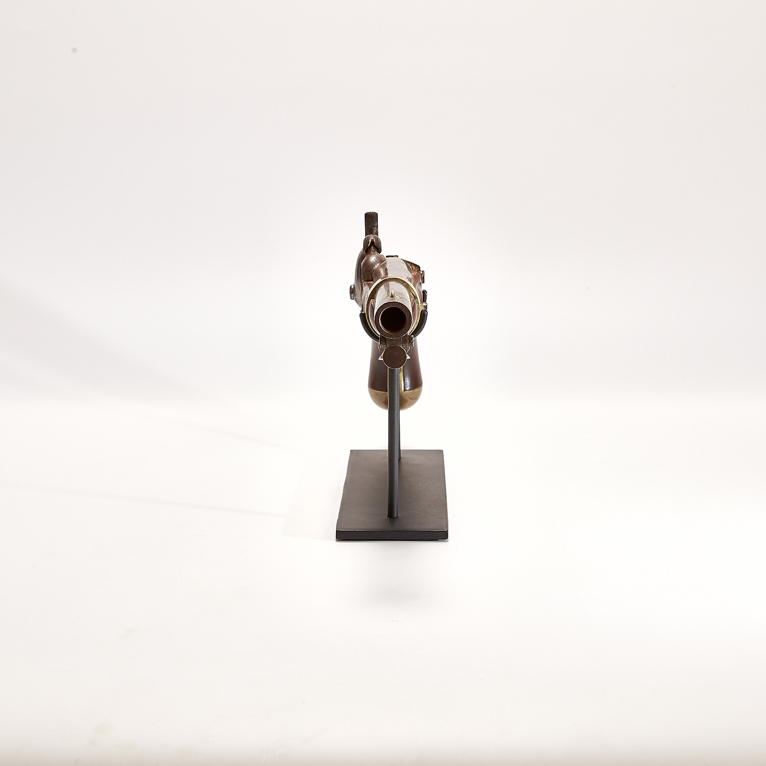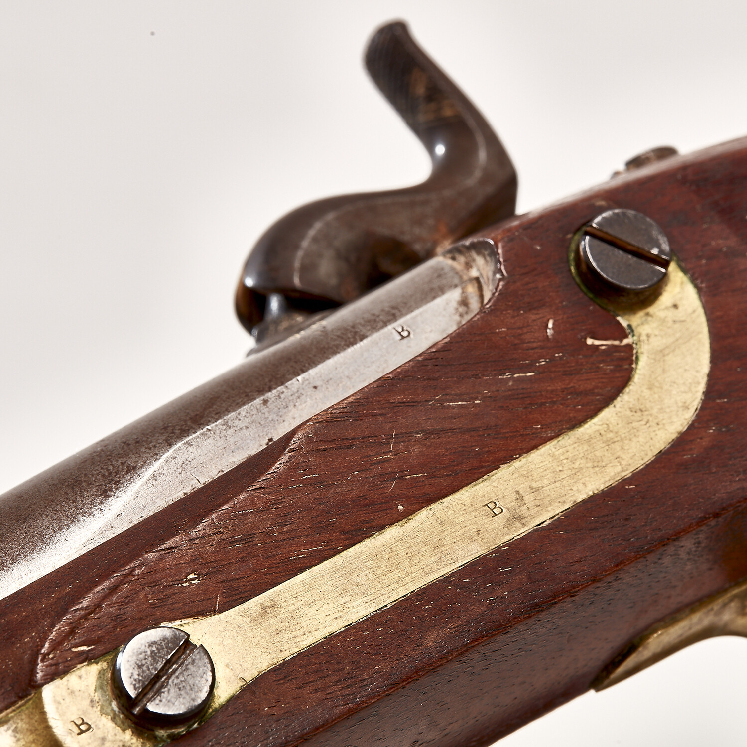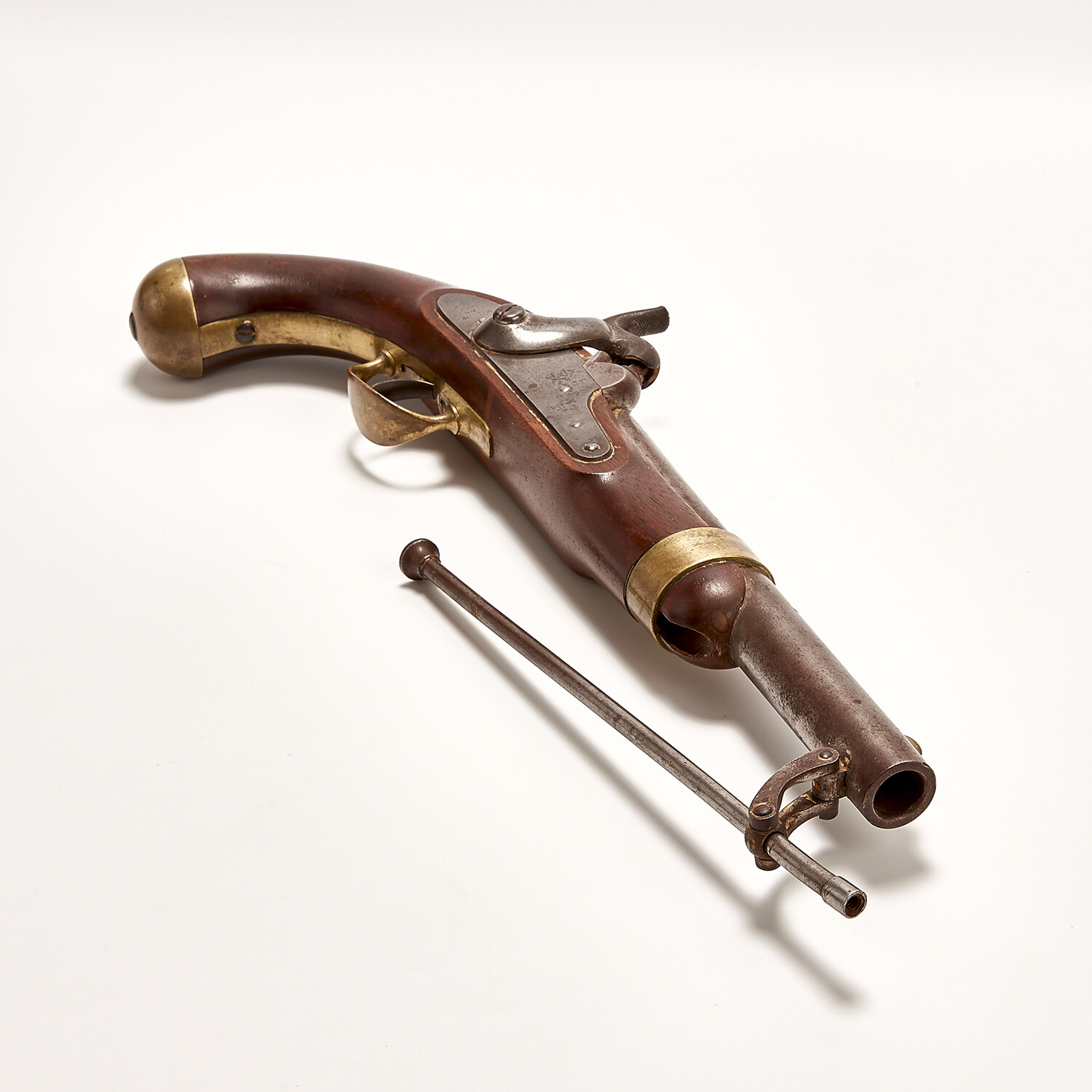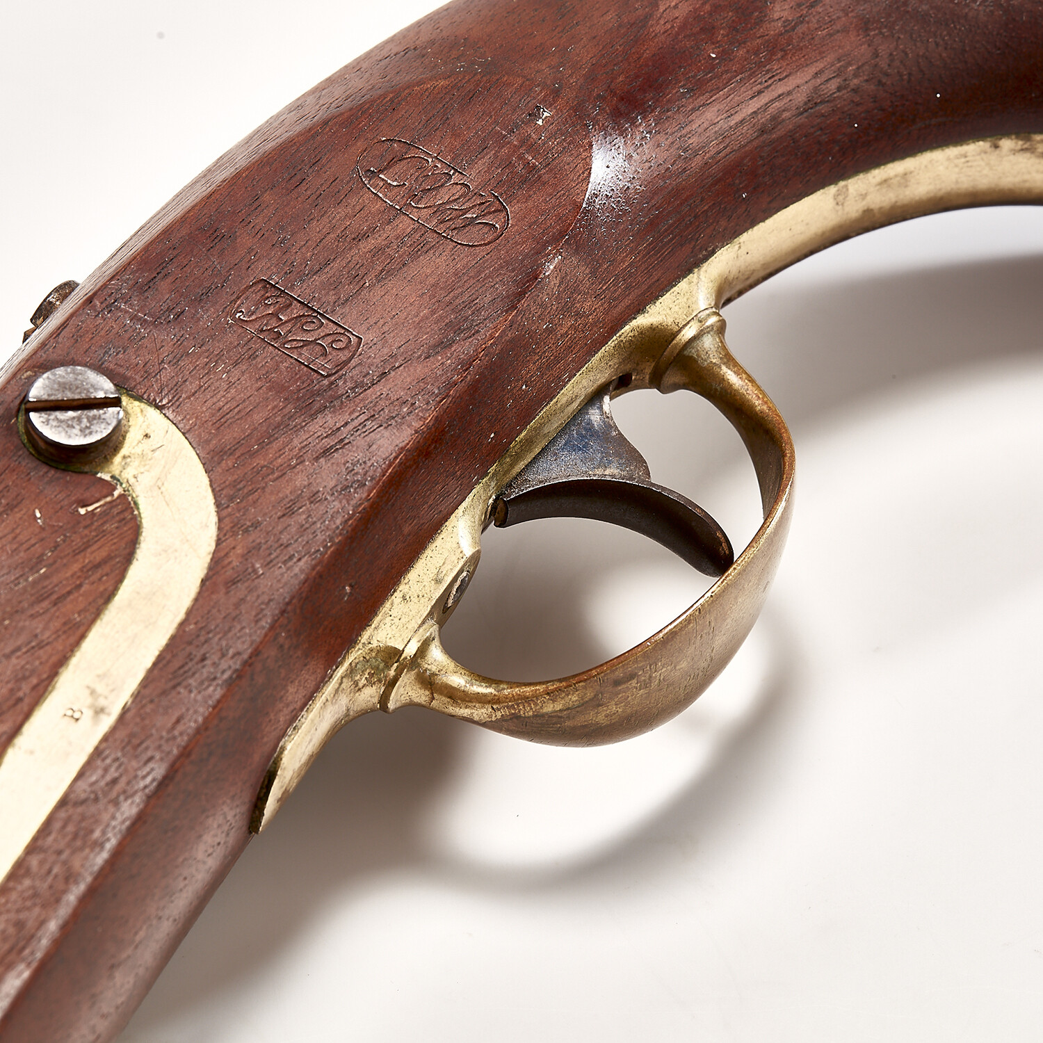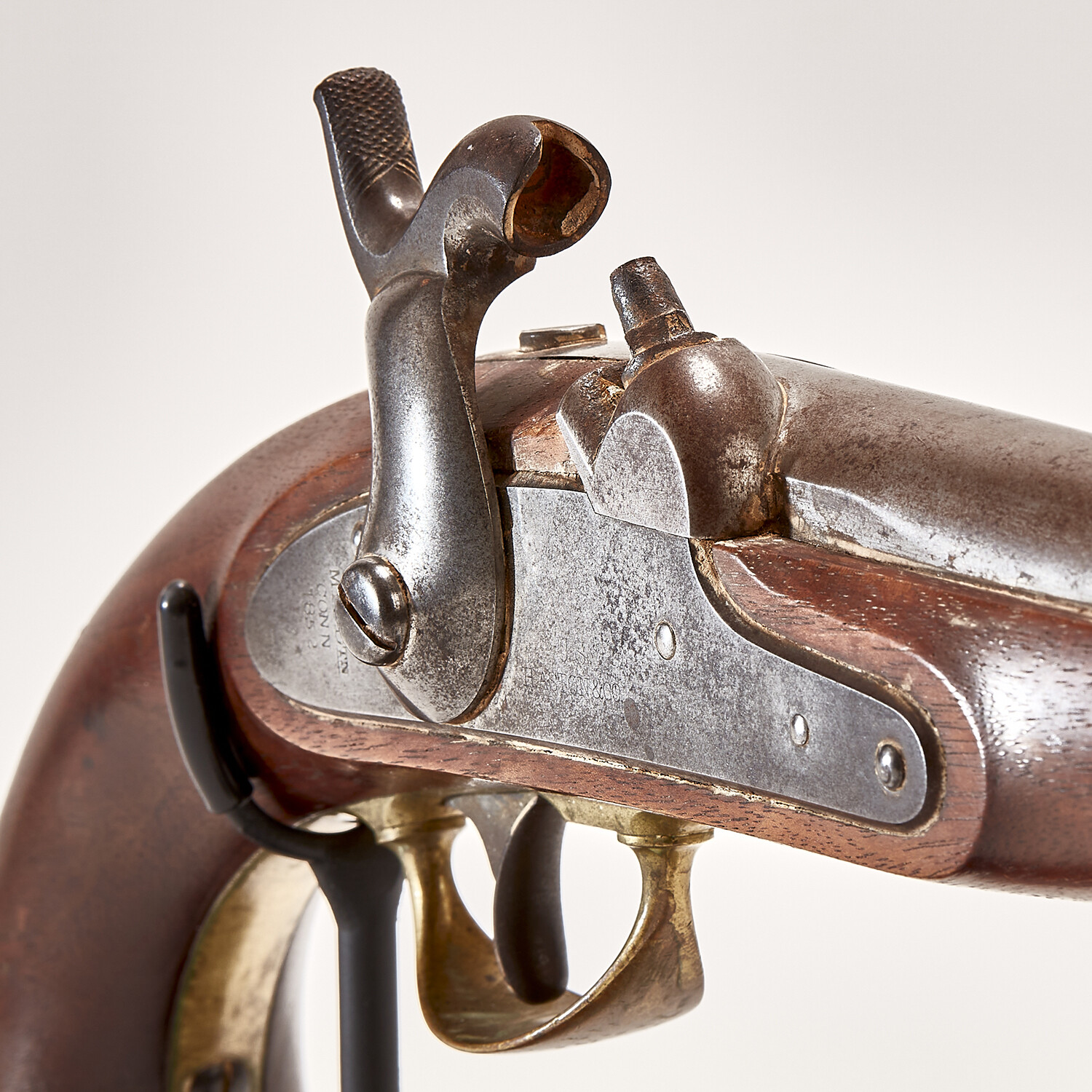 An early American model 1842 US Aston & Company .54 caliber percussion pistol, manufactured in 1852 in Middletown, CT. With brass trigger guard, grip tang, barrel band, hinged metal ram rod, and stamped hammer plate stating “US H ASTON MIDD'TN CONN 1852.” The pistol has a beautifully preserved 8.5” smooth-bore iron barrel. The walnut stock with a visible Cartouche on its left flat and stamped proof marks on top of barrel. Total pistol length 14.25”. The hammer stays at half and full cock with strong action, the metal is polished and extremely well preserved. Ex Middletown, NY collection. With custom metal stand (entire display measures 14.25”L x 2.75”W x 7.5”H). This is an antique, and not warranted safe to shoot without restoration and the aid of a skilled professional. An attractive and historic display-piece! Accompanied by a hand-signed certificate of authenticity which includes all the details, culture, dating, motifs/inscriptions when applicable, historical relevance, and provenance.