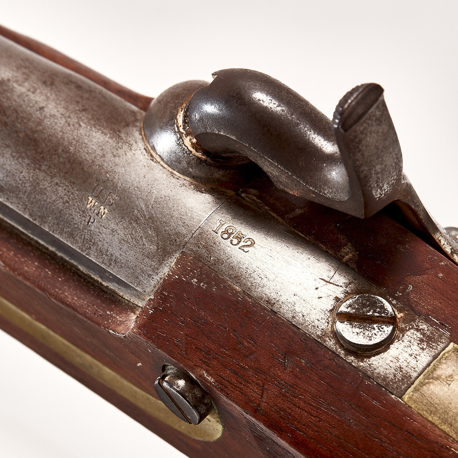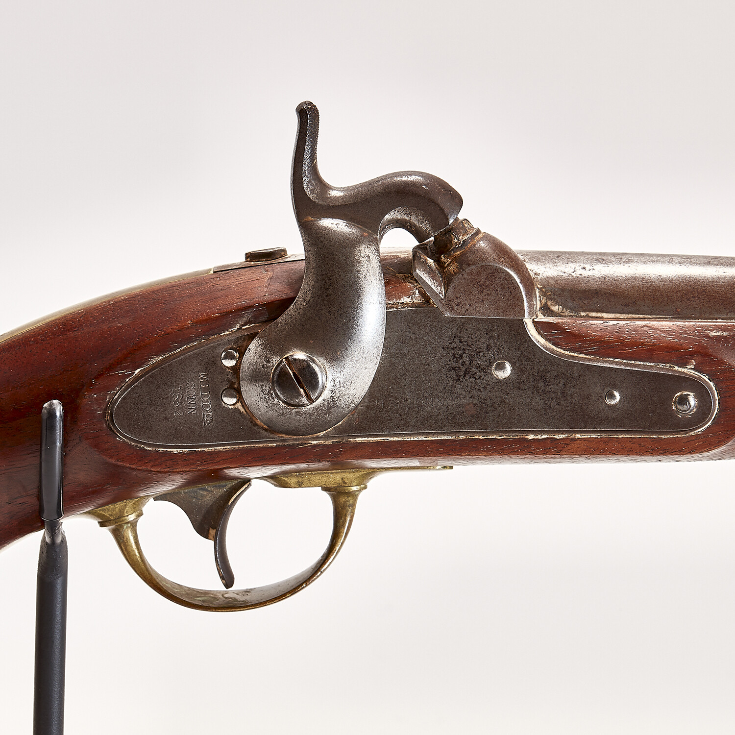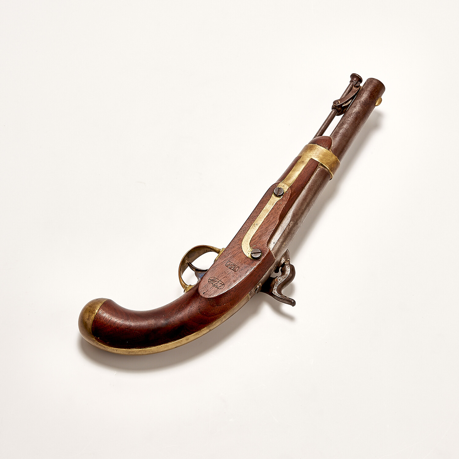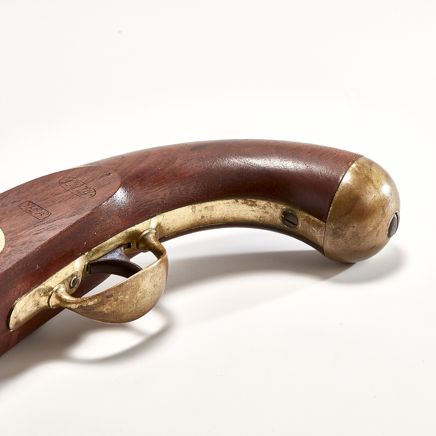 An early American model 1842 US Aston & Company .54 caliber percussion pistol, manufactured in 1852 in Middletown, CT. With brass trigger guard, grip tang, barrel band, hinged metal ram rod, and stamped hammer plate stating “US H ASTON MIDD'TN CONN 1852.” The pistol has a beautifully preserved 8.5” smooth-bore iron barrel. The walnut stock with a visible Cartouche on its left flat and stamped proof marks on top of barrel. Total pistol length 14.25”. The hammer stays at half and full cock with strong action, the metal is polished and extremely well preserved. Ex Middletown, NY collection. With custom metal stand (entire display measures 14.25”L x 2.75”W x 7.5”H). This is an antique, and not warranted safe to shoot without restoration and the aid of a skilled professional. An attractive and historic display-piece! Accompanied by a hand-signed certificate of authenticity which includes all the details, culture, dating, motifs/inscriptions when applicable, historical relevance, and provenance.