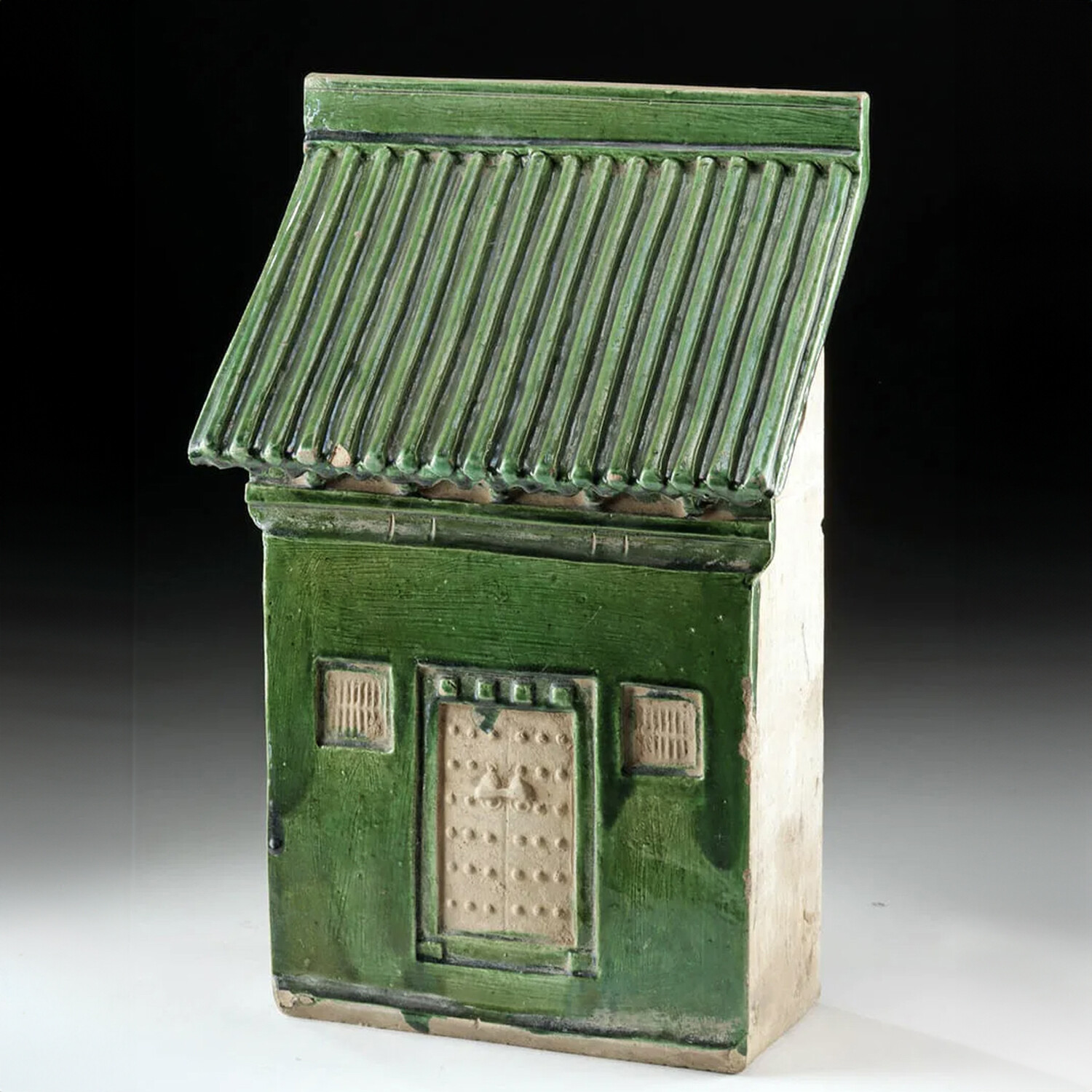 Ancient China, Ming Dynasty, c. 1368 - 1644 AD. A large and fantastic glazed pottery model of a traditional architectural structure, most likely a spirit house (mingqi), intended for placement in a tomb to provide a home for the deceased in the afterlife. The rectangular form is topped by a steeply pitched roof with evenly ribbed tiles, all covered in a green glaze typical of Ming-era burial wares. The front facade displays a central door panel with raised bosses and two flanking lattice-style windows, all molded in shallow relief and coated in a creamy white slip. The piece is hollow with large vent holes on the sides. These models echoed real estate holdings in life and ensured continued comfort and status in the next world. Size: 10.25" W x 16" H (26.2 cm x 40.6 cm). Chips and abrasions, but otherwise intact and excellent. Heavy mineral and earthen deposits inside. Provenance: Ex Kayvan estate, Los Angeles, California, acquired from a Los Angeles, California, gallery between the late 1990s to 2005. Accompanied by a hand-signed certificate of authenticity which includes all the details, culture, dating, motifs/inscriptions when applicable, historical relevance, and provenance.