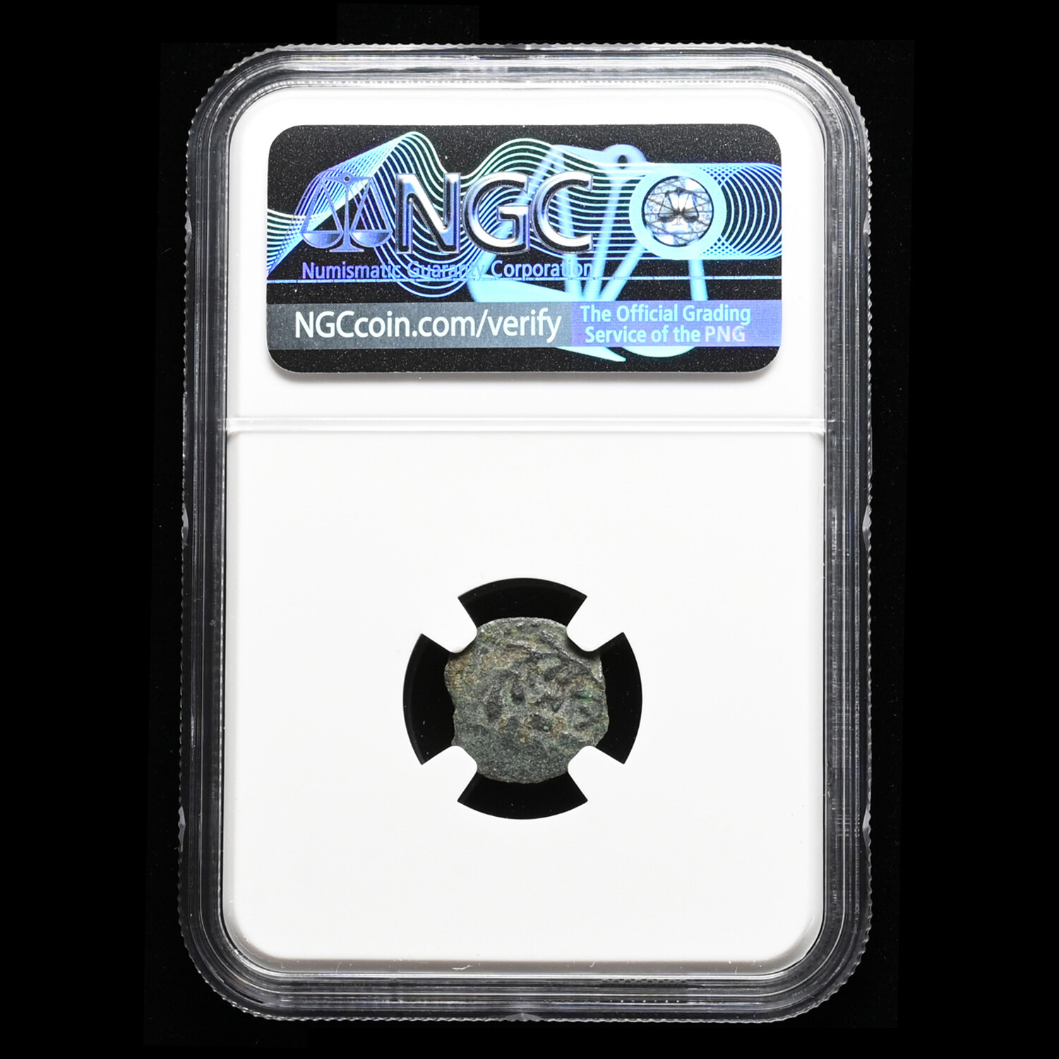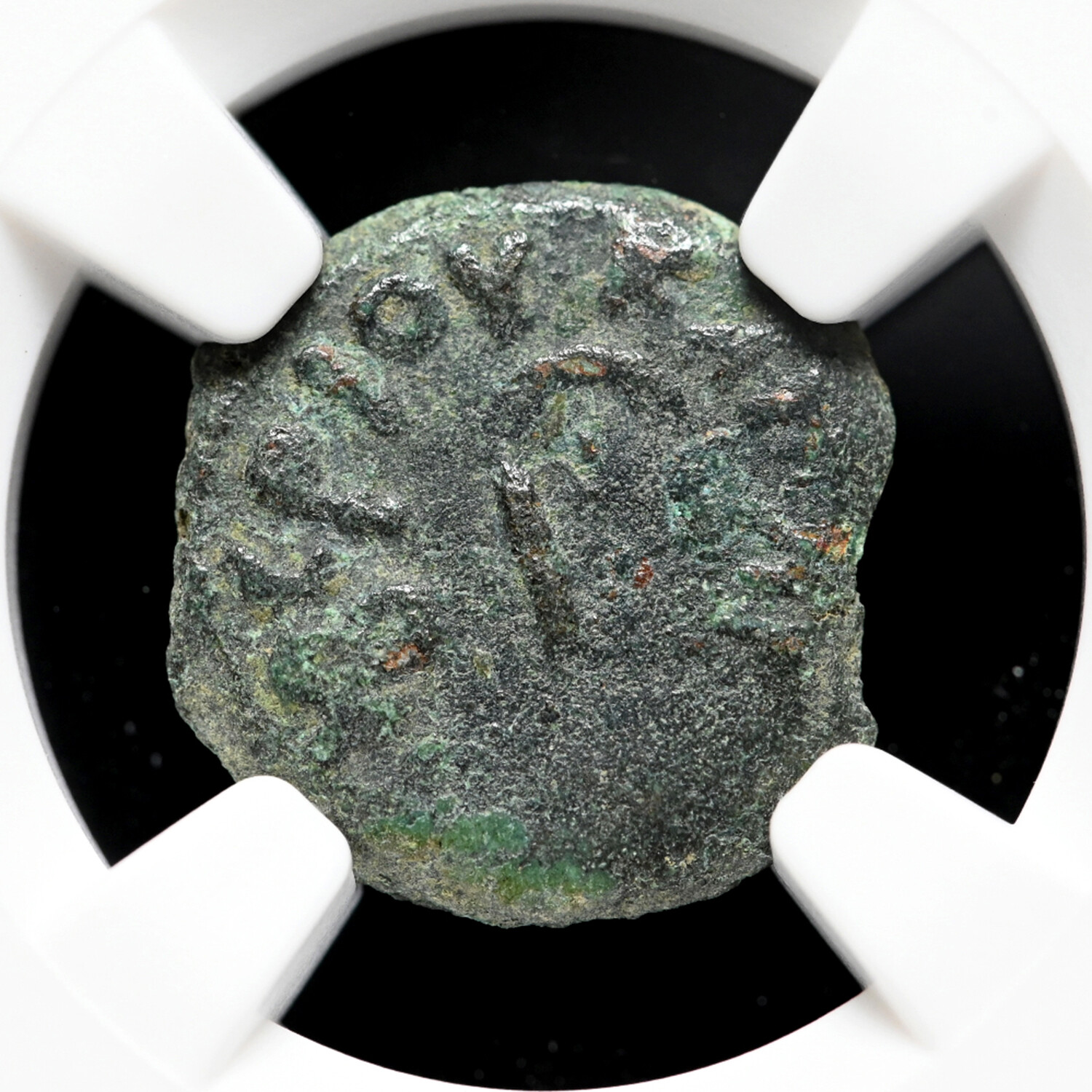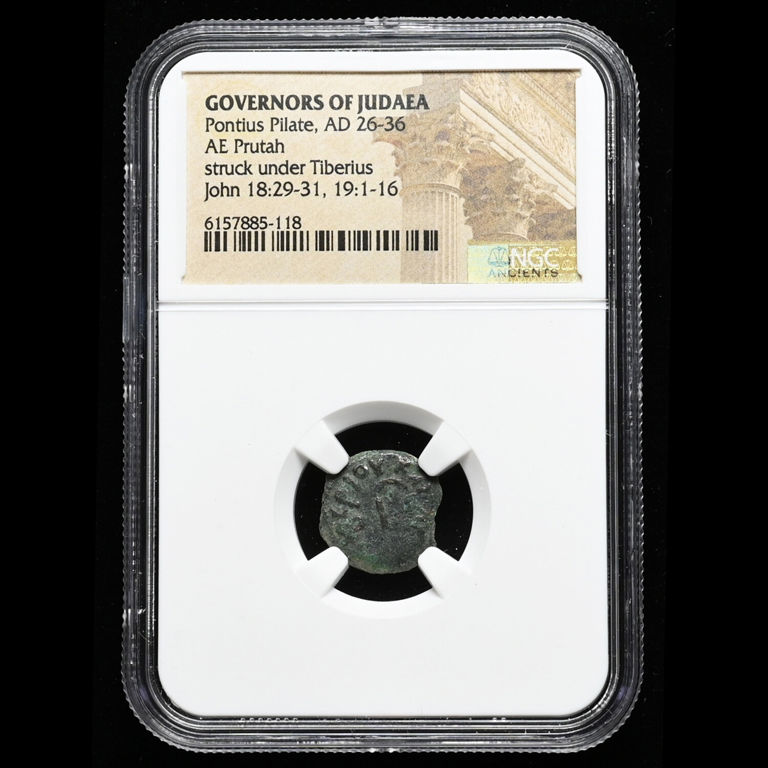 Holy Land, Biblical Judaea. Pontius Pilate, 26-36 AD. Bronze lepton, struck 30-31 AD, Jerusalem mint. The front depicts a Lituus (priestly device), inscription TIBEPIOY KAICAPOC around / The back depicts the Date in wreath: LIZ (Year 17=30-31 AD). Coin reference: Hendin 1343 for type. Deep olive-green patina, good detail. Encapsulated and certified by NGC. Coin measures 14mm diameter; archival slab measures 3.125" x 2.125" x 0.375”. Provenance: Ex De Père, WI collection.*** Pontius Pilate was mentioned in all four Christian Gospels, including John 18:29-31 and Matthew 27:2. He was the Roman procurator (governor) of Judaea who presided over the trial of Christ and ordered his crucifixion. Provenance: Ex De Père, WI collection. Accompanied by a hand-signed certificate of authenticity which includes all the details, culture, dating, motifs/inscriptions when applicable, historical relevance, and provenance.