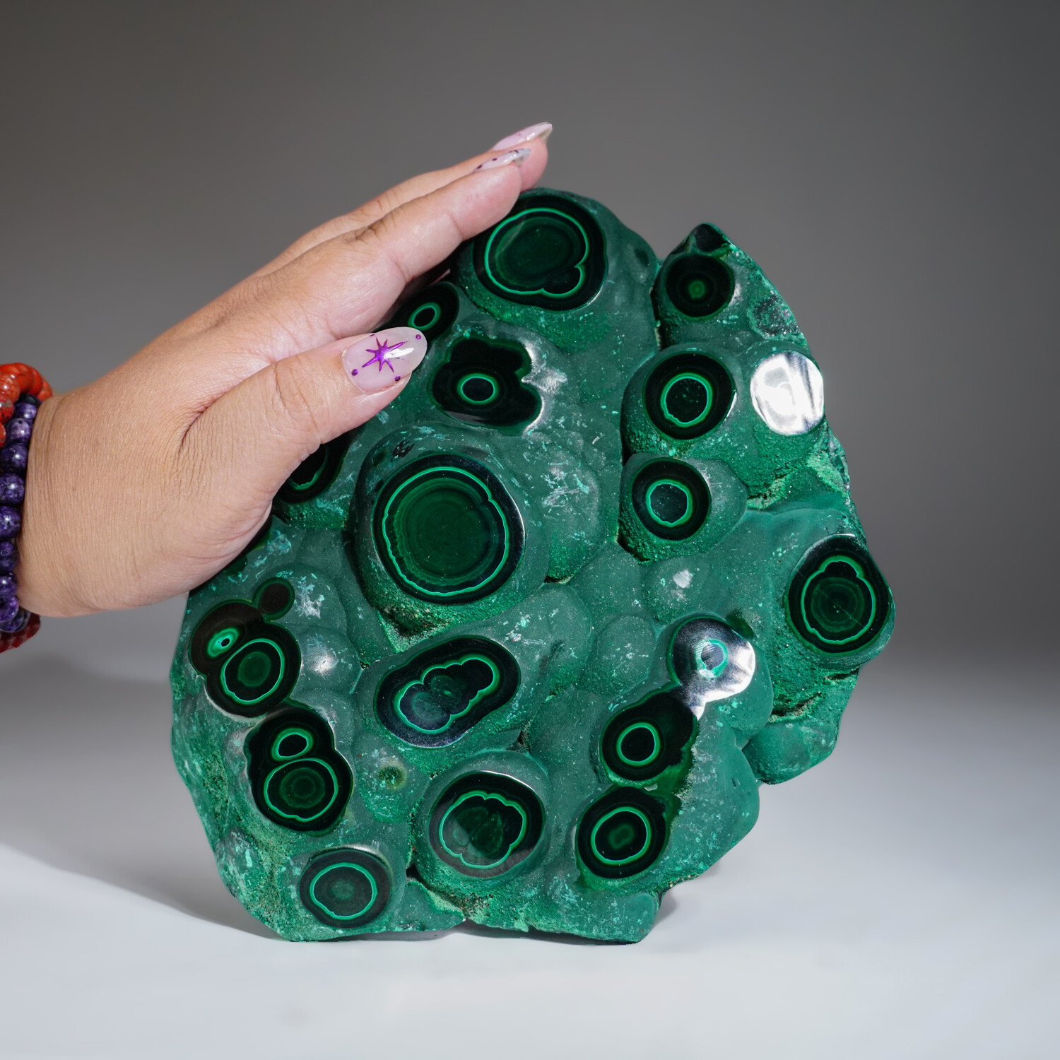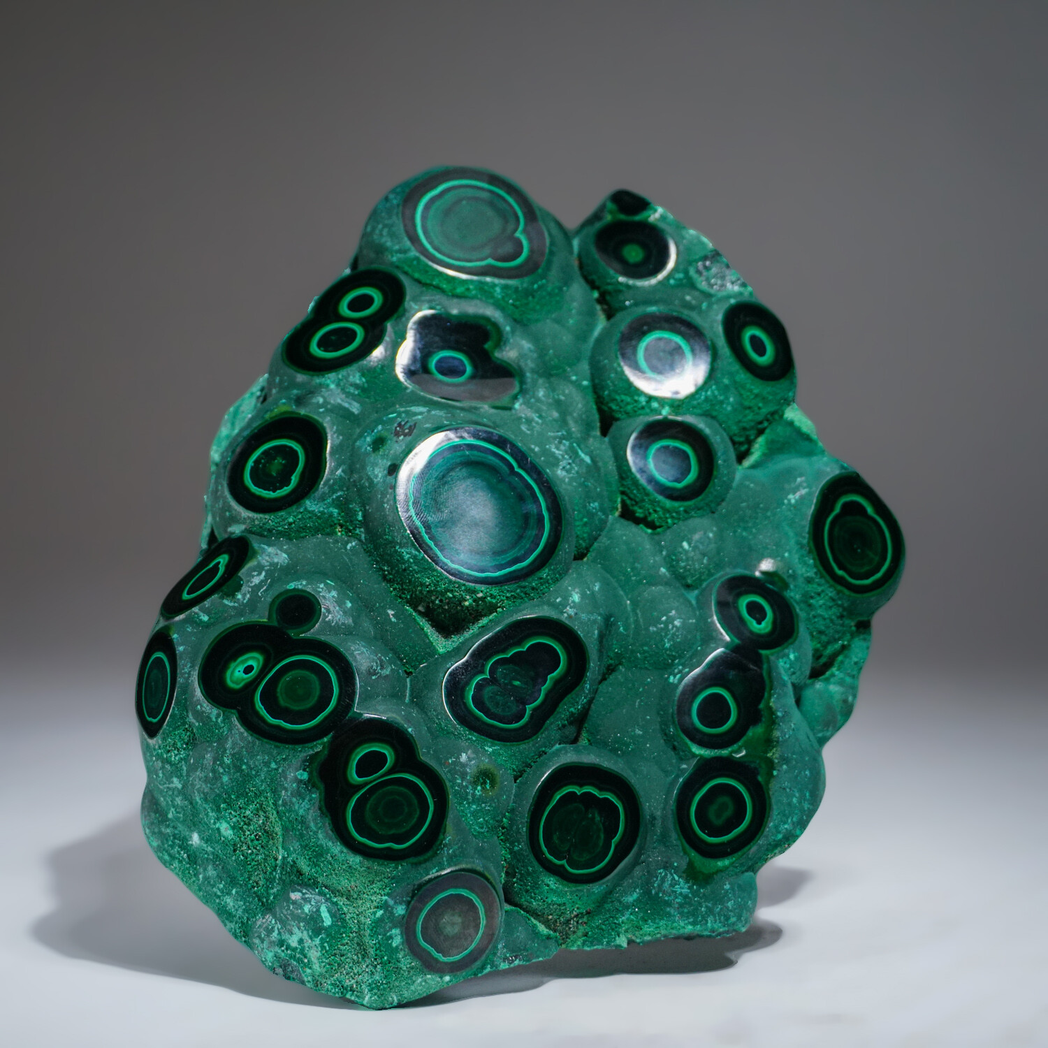 AAA-quality solid freeform of Natural Bulls Eye Malachite from The Democratic Republic of Congo. This specimen has well defined banded concentric patterns. The piece is made of solid material with no fill whatsoever and is polished to a high-yield mirror finish.