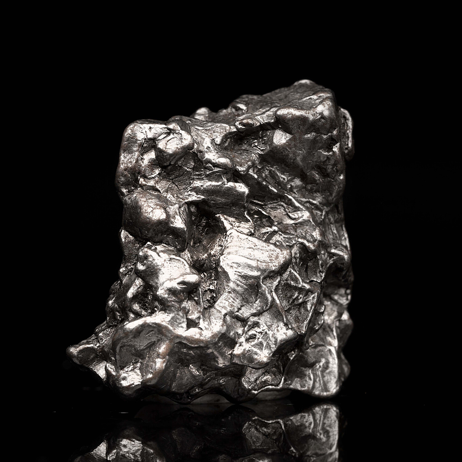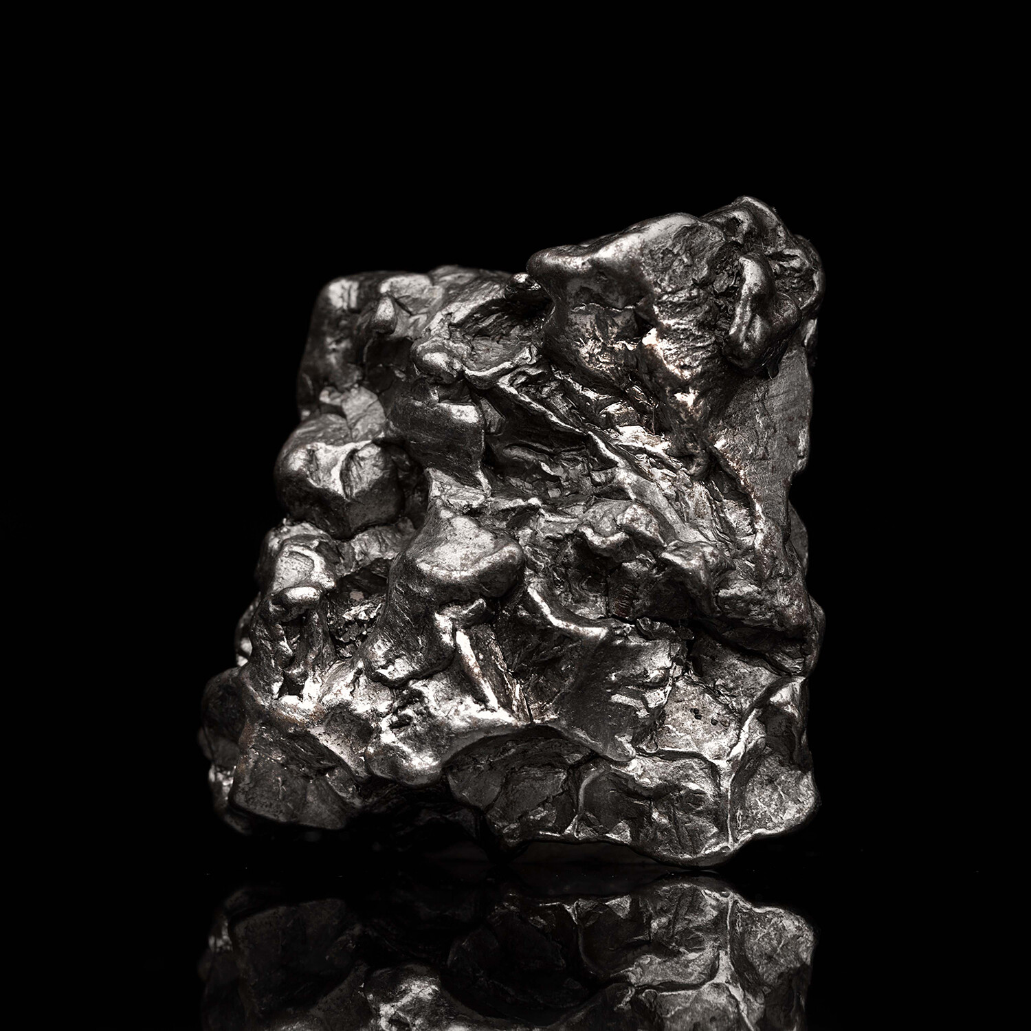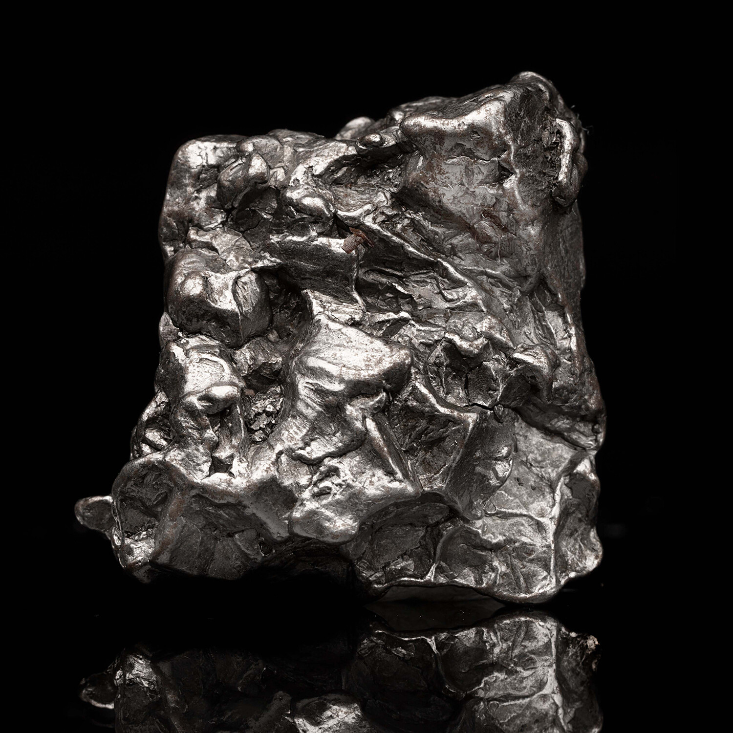 The Campo del Cielo iron meteorites were discovered in 1576 about 500 miles northwest of Buenos Aires, Argentina. Testing proved the "rocks" to be meteorites. It is estimated that the meteorites fell 4,000-6,000 years ago at Campo del Cielo (meaning field of sky or heaven) in Gran Chaco, Gualambia, giving credence to the fact that this was a meteorite fall (witnessed by man when falling to the earth) rather than a find, especially since larger pieces were discovered in and around a series of small craters in a field. Twelve very large craters have been found by searchers. The largest Campo meteorite weighs about 30 tons; understandably, it is one of Argentina's national treasures. This meteorite is classed as a coarse octahedrite. The composition is about 94% iron and 6% nickel. A number of scarce minerals are present as well, including kamacite, taenite, plessite, triolite, graphite, and silicates. Campo meteorites are well known for their silicate inclusions and are estimated to date back 4.6 billion years. The cube in the picture is approximately one centimeter.