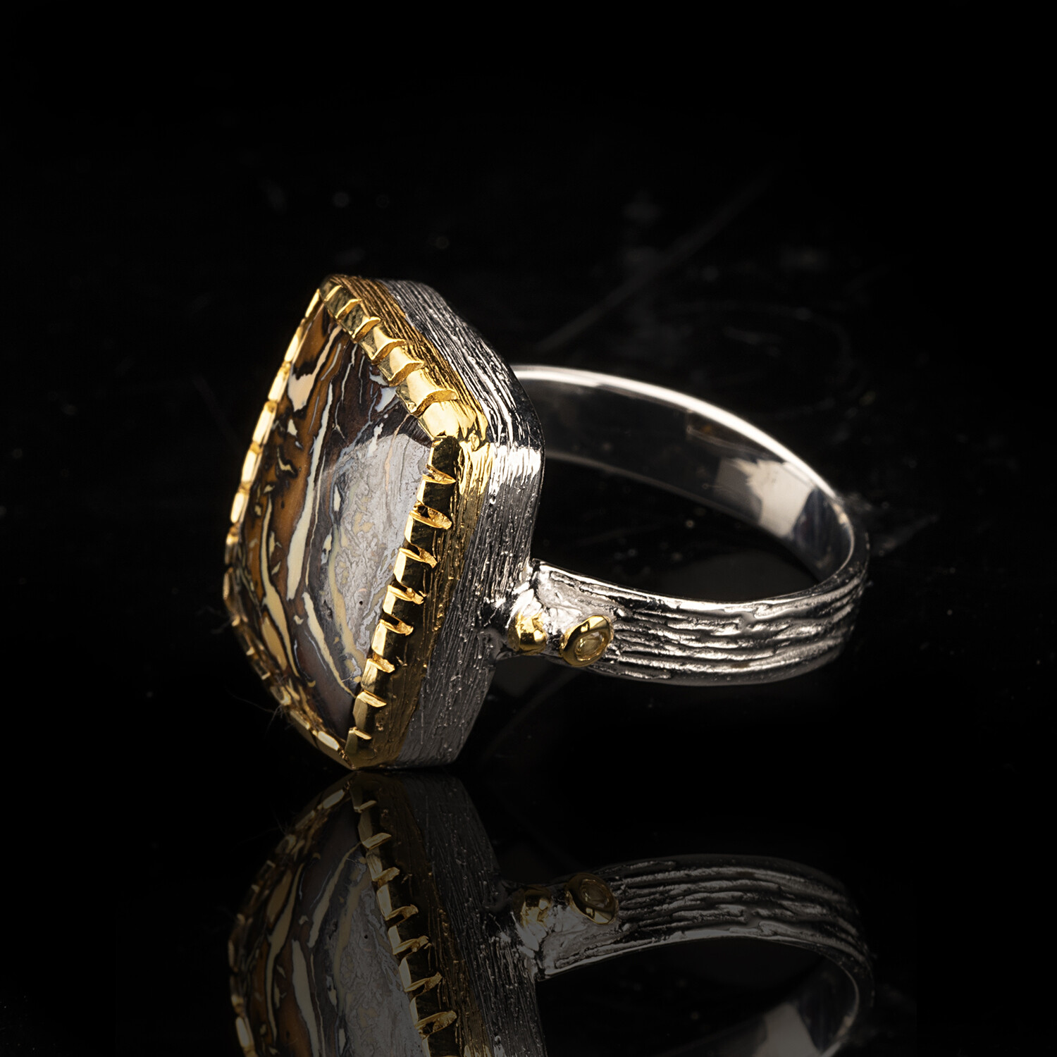 This gorgeous ring features a rectangular-cut boulder opal displaying painterly swirls of brown, black, white, and tan, edged in 14 karat gold leaf, set in genuine sterling silver, and flanked by two sparkling yellow sapphires. Dimensions given are of the main setting.
