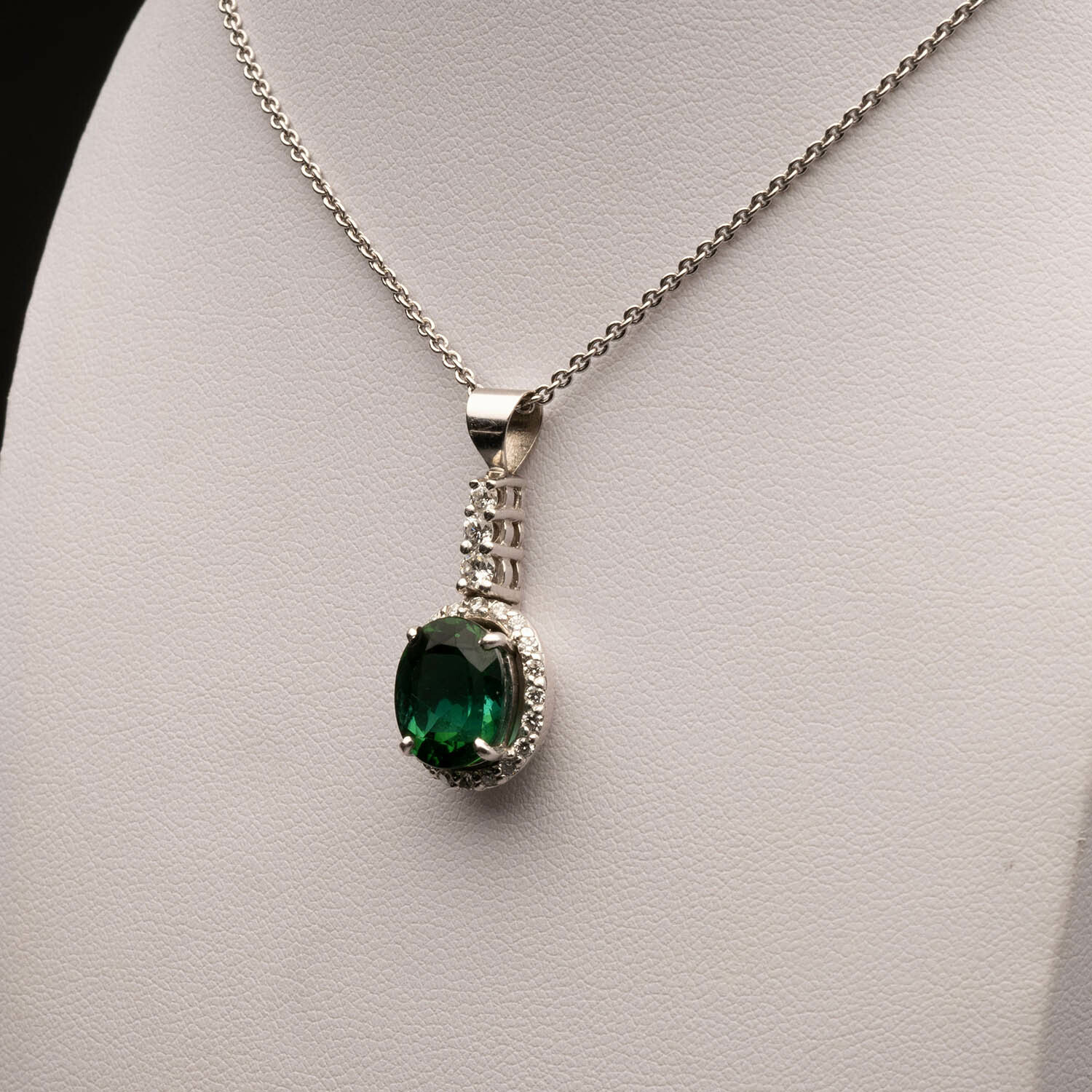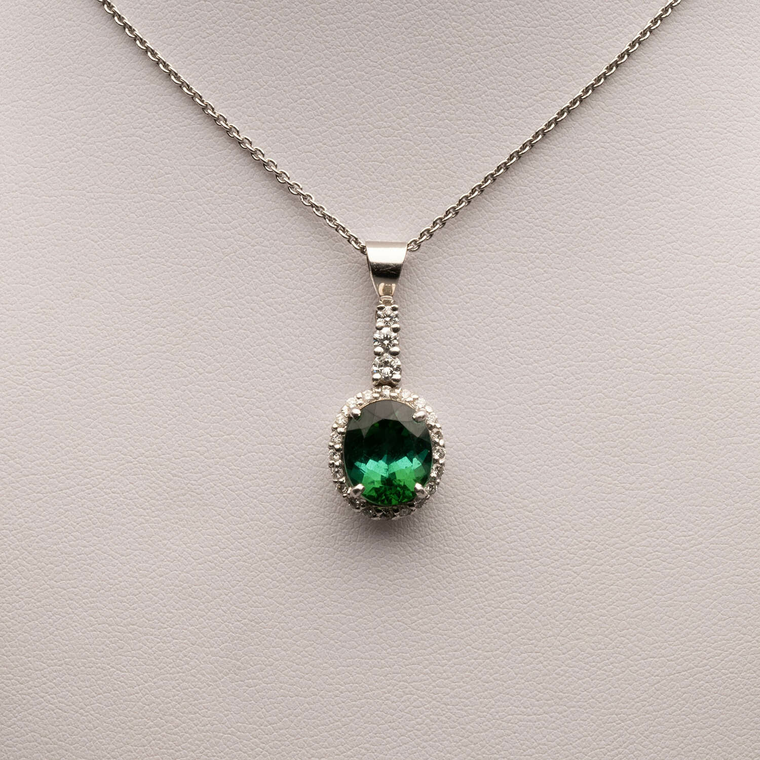 This sparkling green-drenched chrome tourmaline is set off brilliantly by a generous display of white diamonds in white gold to fashion an elegant pendant certain to stun.
