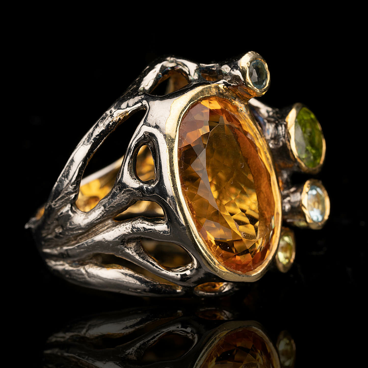 This showpiece boasts a huge faceted oval cut citrine contrasted by two round cut peridots and two sparkling round cut blue topaz stones all set in genuine sterling silver with 14 karat gold accents for a colorful and dynamic piece sure to turn heads.