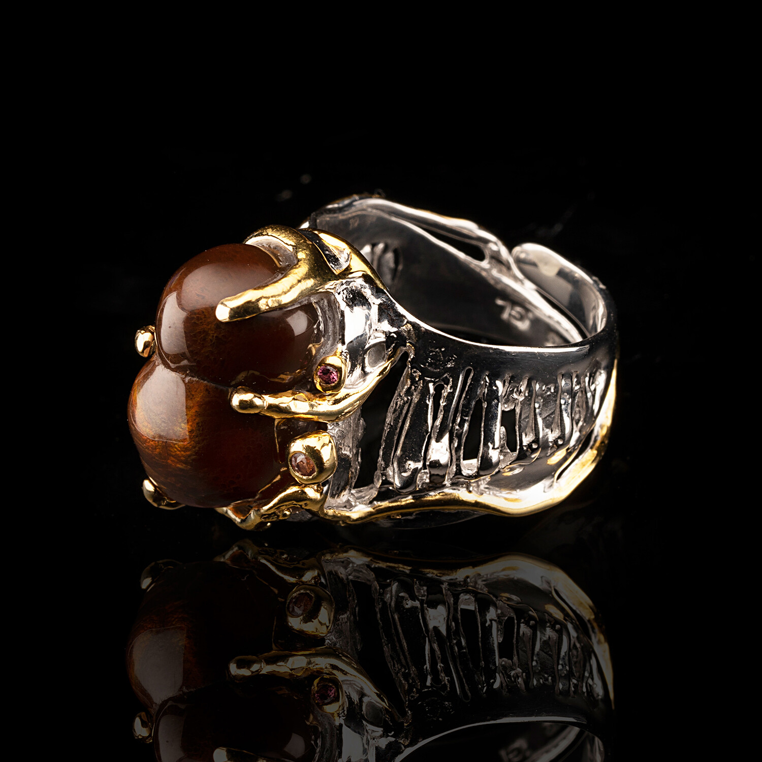 This adjustable sterling silver ring with 14 karat gold leaf detail features a gorgeous freeform specimen of fire agate boasting rich reddish-brown tones set with sparkling sapphires which bring out the red in the agate. A unique wearable piece of natural art.