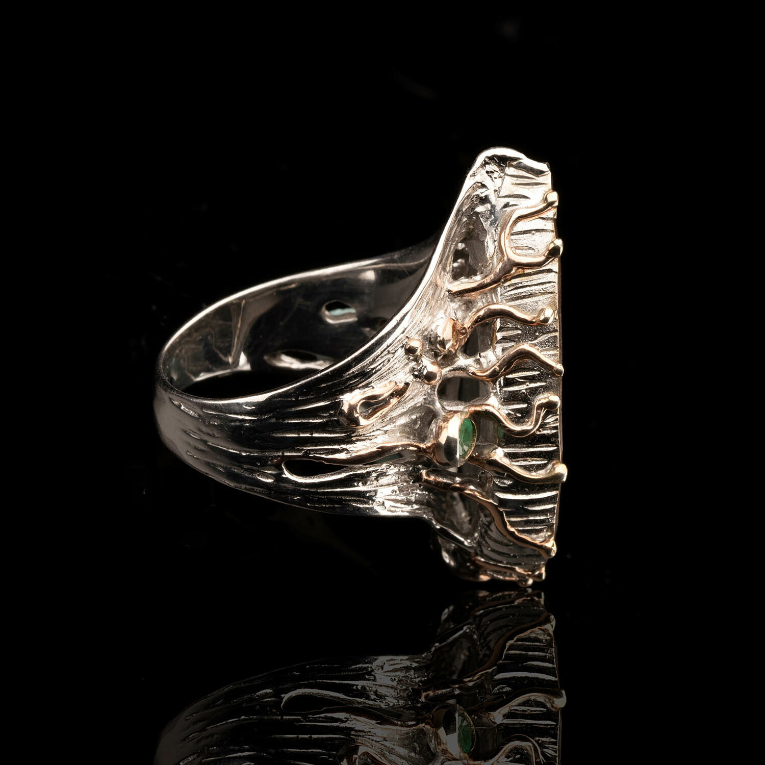 This luminous ring features a large teardrop of ammolite, which is created when aragonite forms in layers over the outer shell of an ammonite fossil for an opalization effect. The almost electric colors of this genuine fossil and gemstone are accented by sparkling emeralds and yellow sapphires on the sides of the setting. The stones are set in genuine sterling silver with 14 karat gold leaf.
