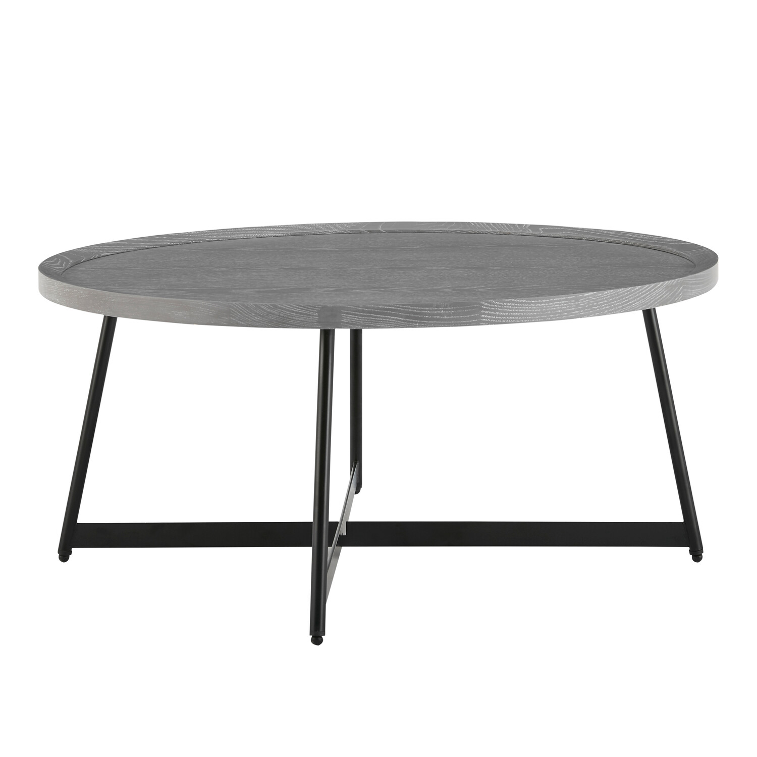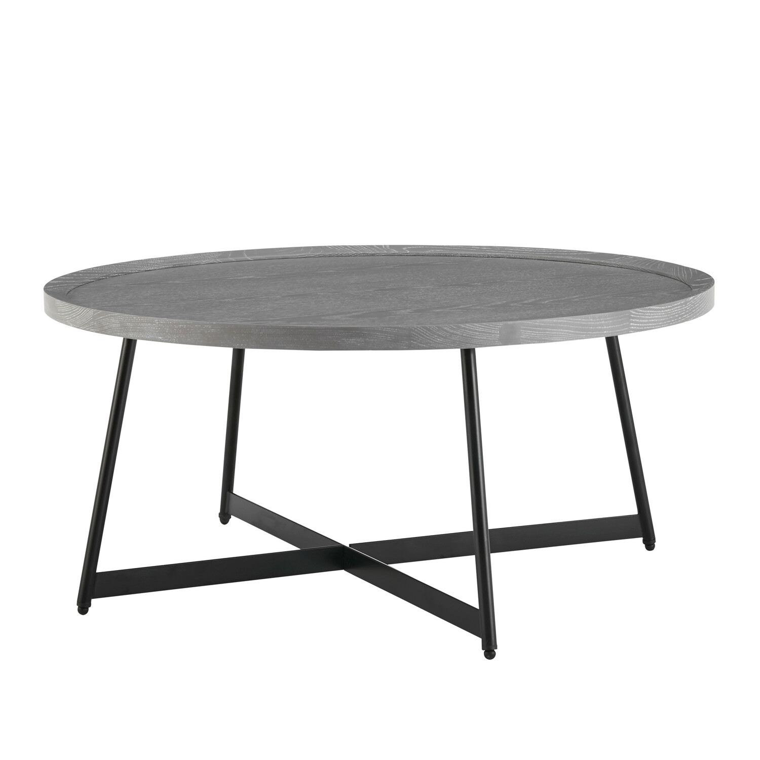 The Niklaus Round Coffee Table is both perfectly symmetrical, and distinguished. With a stained oak veneer top and a steel base, this table will catch the eye of any wandering guest. Prominent and bold, while also graceful.