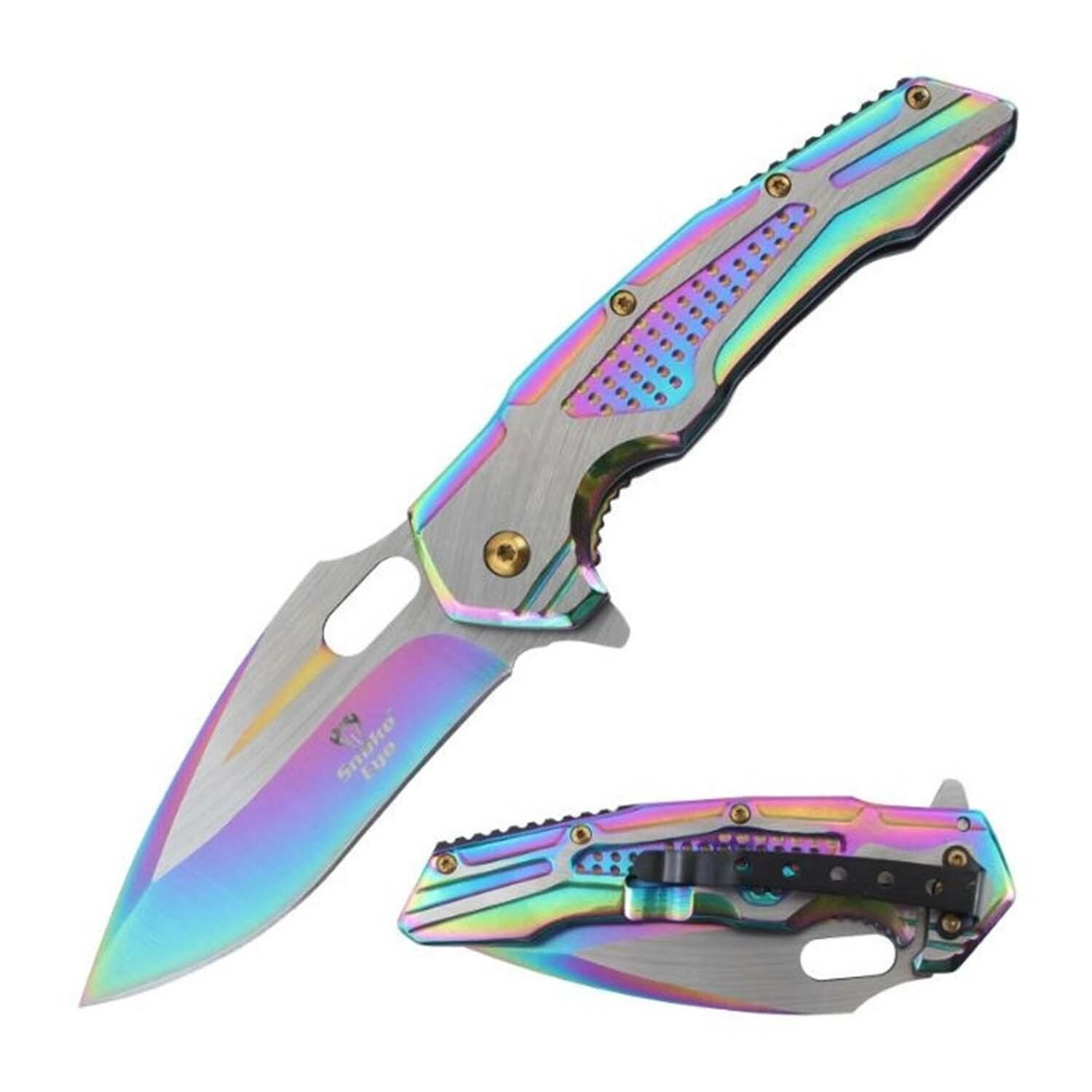 This collection of spring assisted pocket knives is built for fast, reliable one handed use with bold, graphic designs that stand out. Each piece features a tension driven opening mechanism for quick deployment, textured grips for control, and durable stainless steel blades suited for everyday tasks. From tactical profiles to statement finishes, these knives deliver dependable function and solid build quality at an easy entry price.