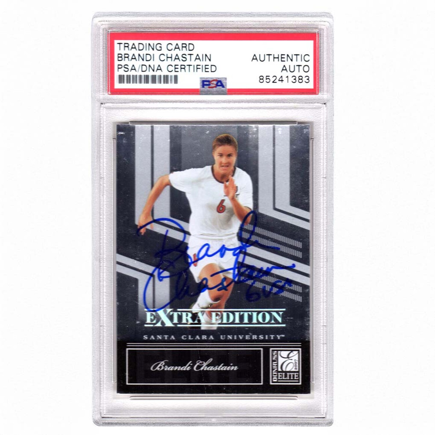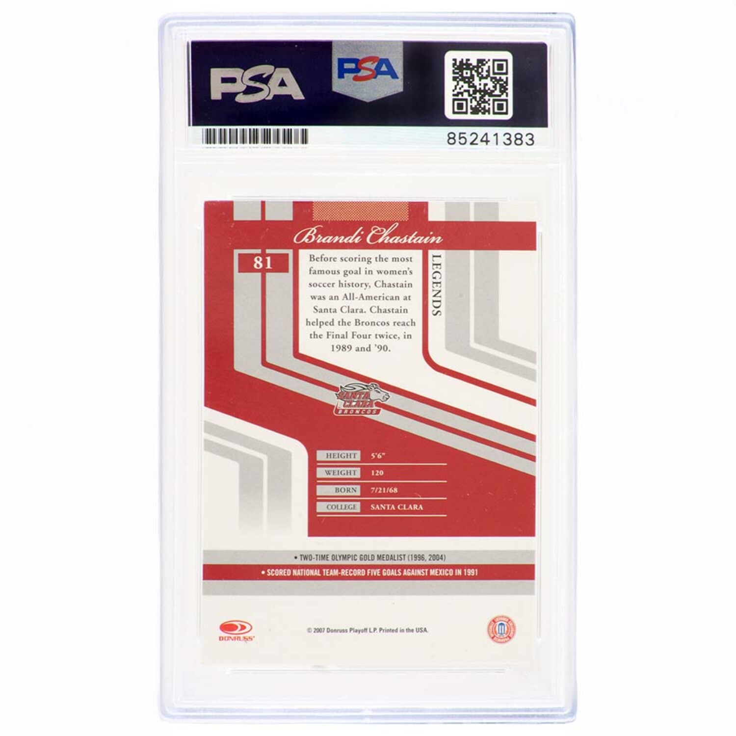 Own a piece of soccer history with this Brandi Chastain Signed 2007 Donruss Elite Card #81. Featuring the iconic star with a bold "USA" inscription, this collectible has been authenticated and encapsulated by PSA/DNA, ensuring authenticity and lasting protection. A must-have for fans of U.S. women’s soccer and legendary sports moments.