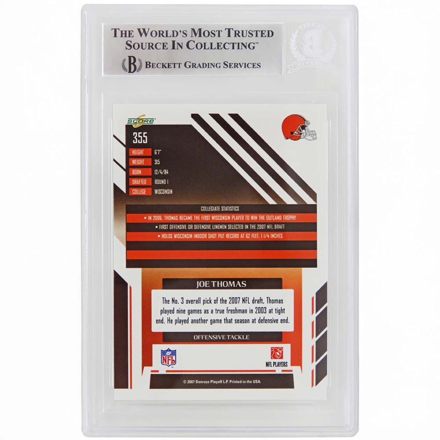 Add a Hall of Fame offensive lineman to your collection with this Joe Thomas Signed 2007 Score Rookie Card #355. Featuring his Cleveland Browns debut, this card has been authenticated and encapsulated by Beckett Authentic, ensuring verified authenticity and protection. Stock image shown; you will receive the same card with matching grade and authentication, though the exact Beckett serial number may vary.