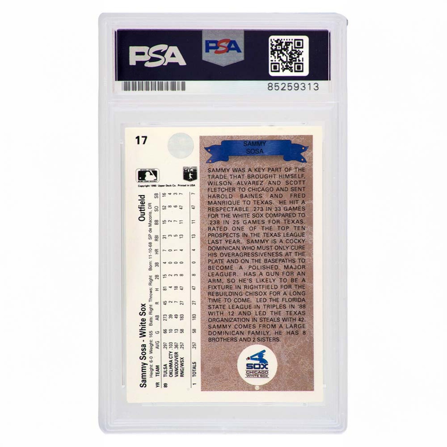 Add a rookie-era collectible with this Sammy Sosa Signed 1990 Upper Deck Card #17. Featuring his Chicago White Sox debut, this card has been authenticated and encapsulated by PSA/DNA, ensuring authenticity and long-term preservation.
