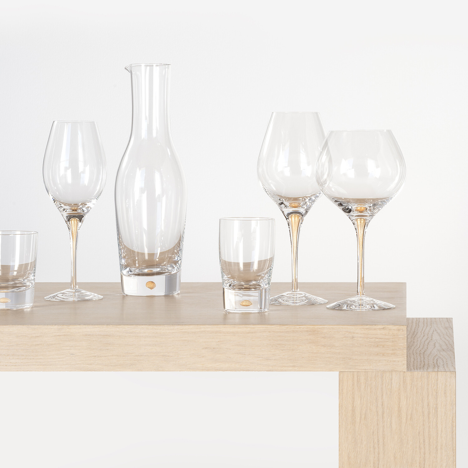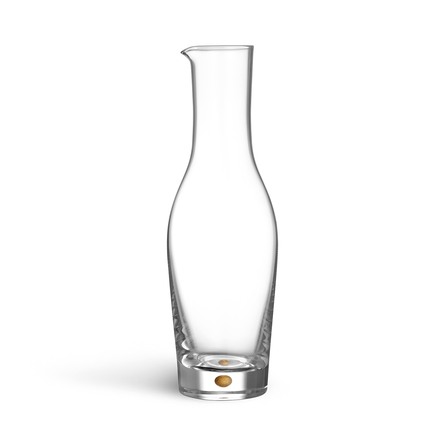 Orrefors craftsmen and Erika Lagerbielke have long tried to fill Intermezzo's characteristic bubble with golden pigment. Finally, it is there, encased in the crystal clear glass – a matte drop shimmering like gold. Intermezzo Carafe, holding 37oz, was designed in 1984 and is intended for both wine and water. The carafe is mouth-blown in Sweden. Designed by Erika Lagerbielke.