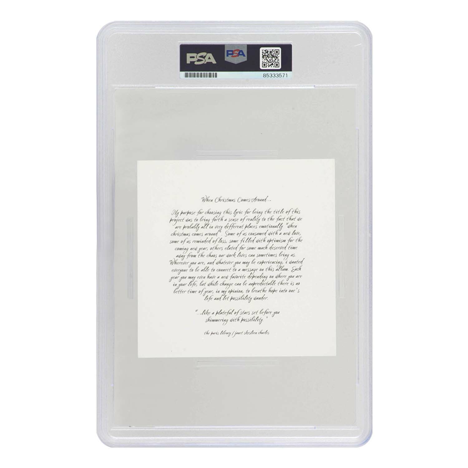 Kelly Clarkson signed 'When Christmas Comes Around' 5x5 CD insert. The encapsulation is an overall size of 6.5x10 inches. The item has been authenticated and encapsulated by PSA/DNA and the authentication number can be verified online.