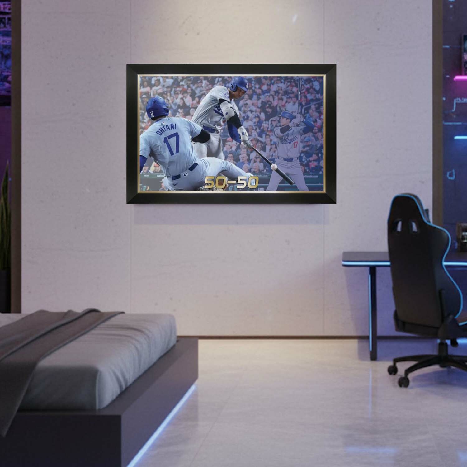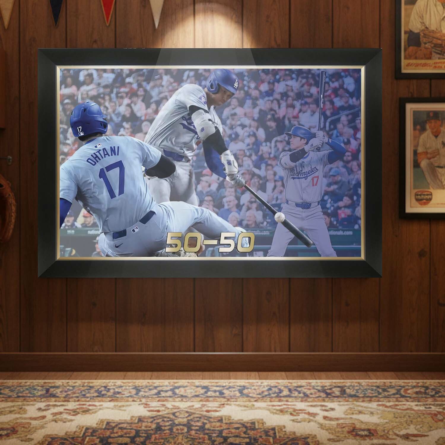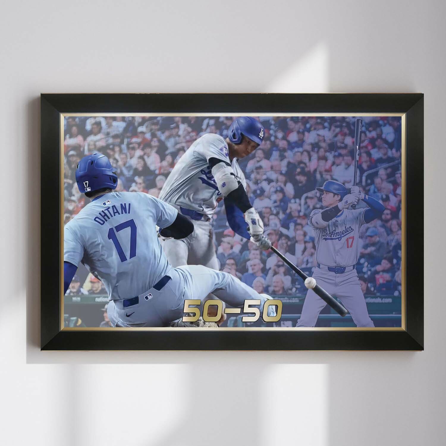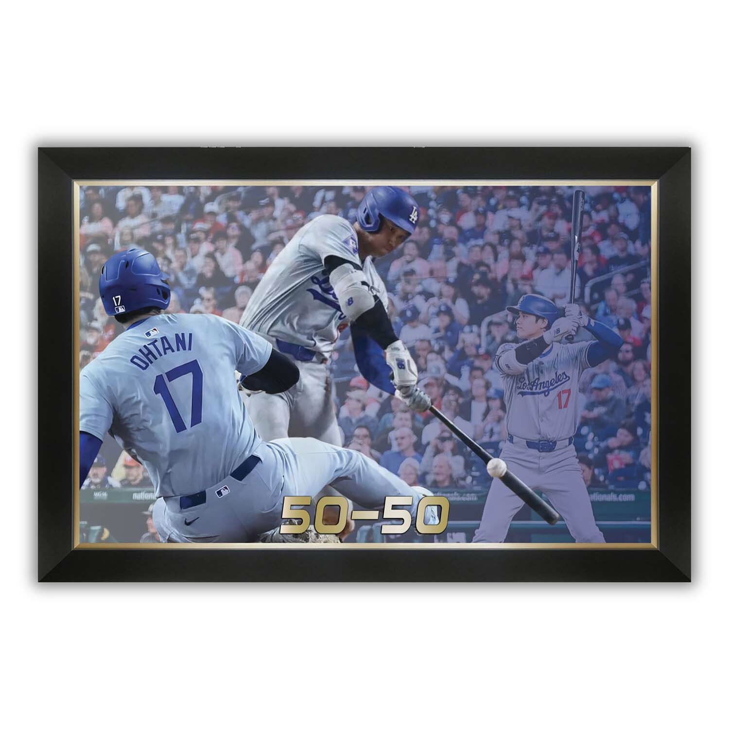 Celebrate the incredible, record-setting skill of Shohei Ohtani with this framed canvas, capturing his historic 50-50 achievement. Combining power and speed like no other, Ohtani made baseball history with 50 home runs and 50 stolen bases, solidifying his place among the game’s greatest players. This beautifully framed piece is a must-have for any serious collector or fan, showcasing the most dynamic player in modern baseball. Perfect for display in your home or office, this 50-50 canvas is a timeless tribute to Ohtani’s groundbreaking accomplishments.