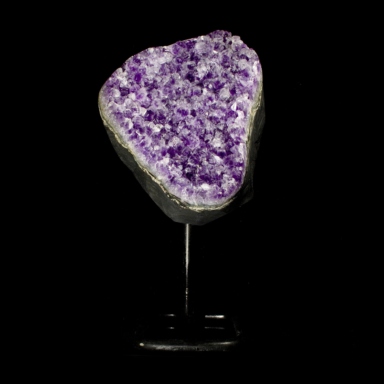 A core of deep purple radiates through these gem clear, beautifully formed crystals of Amethyst. Mounted on a sturdy iron stand presenting the optimal display angle.