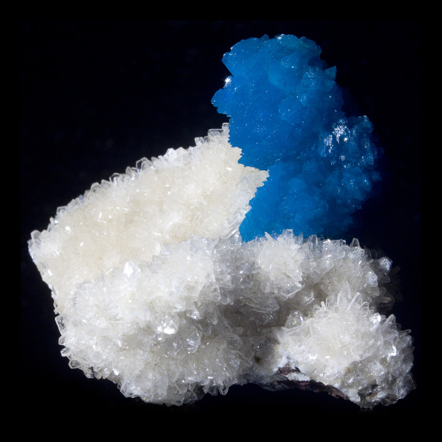 Exceptional Cavansite crystal stack on miniature gemmy Heulandite. The rich blue of Cavansite is highly desirable among collectors. The Wagholi Quarry of Pune, Maharashtra, India was the only mine where large, lustrous crystals of Cavansite have been found. This legendary location has been both closed and overbuilt, making these rare crystals increasingly hard to find. A perfect small cabinet fine mineral.