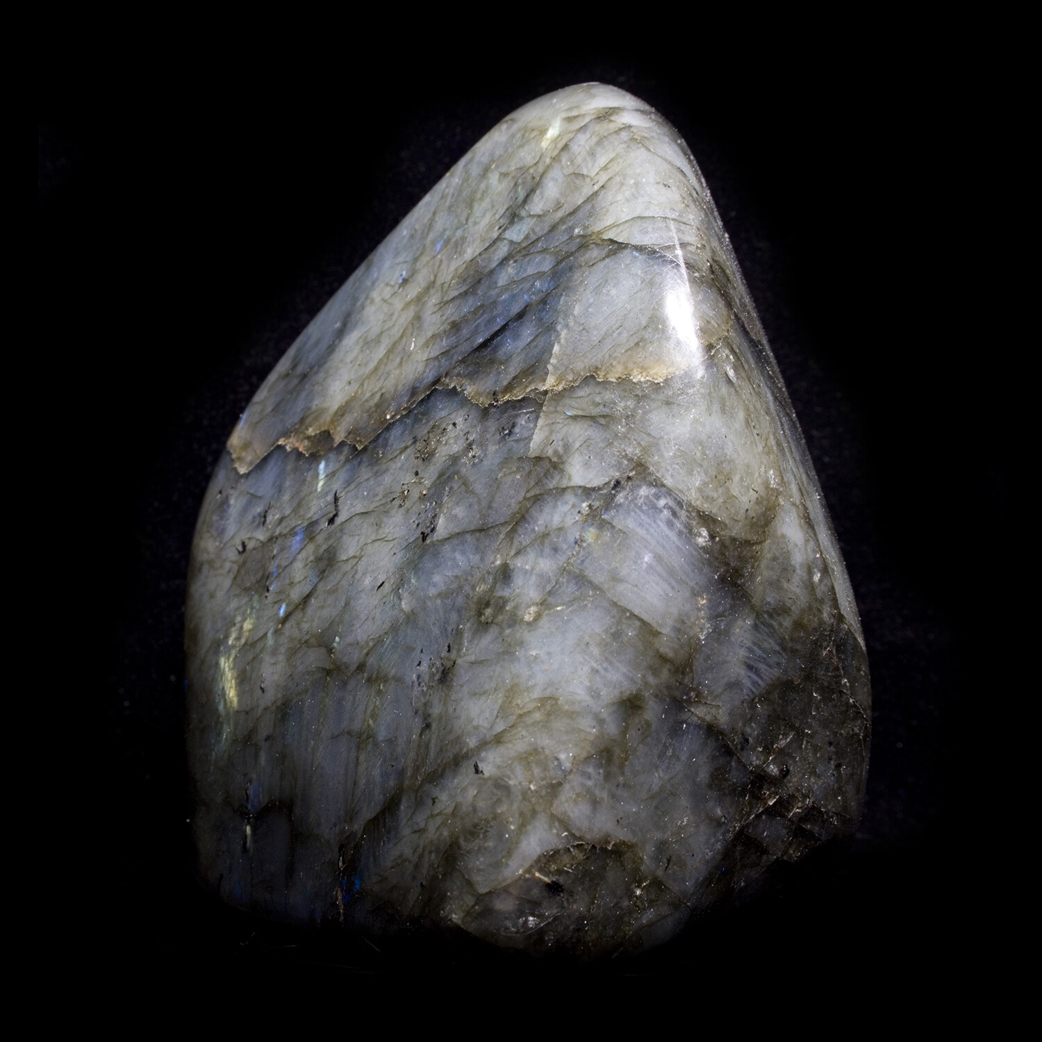 Labradorite, polished on all sides. Labradorite is a spectacularly iridescent mineral which exhibits different colors depending on the angle of the viewer. Labradorescence is not the superficial coloring of the stone, but a property of the light reflected by a surface within.