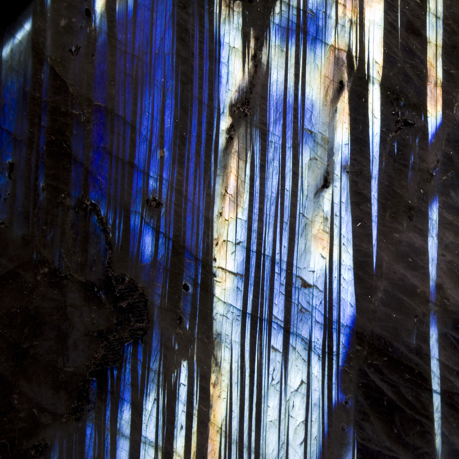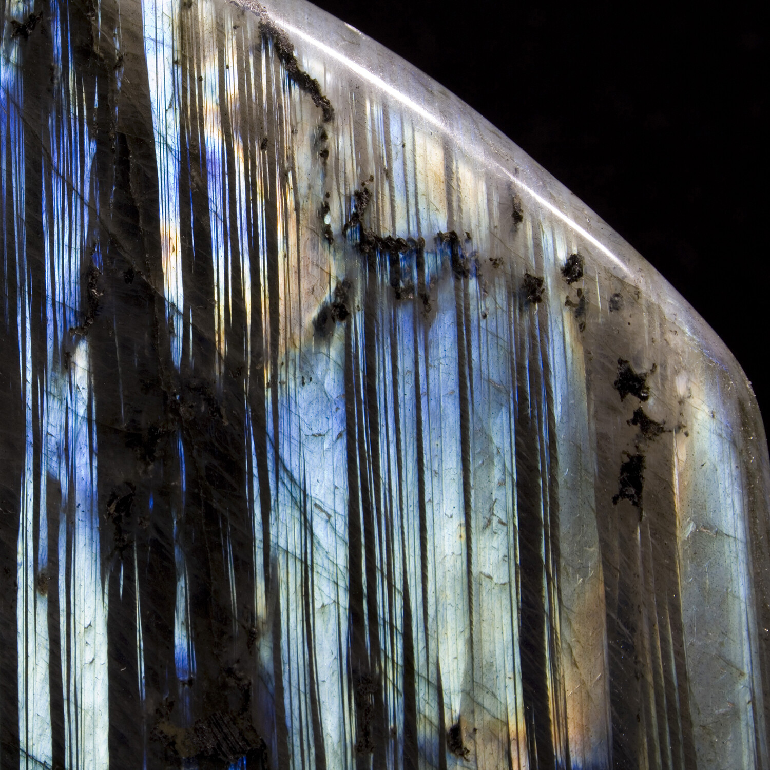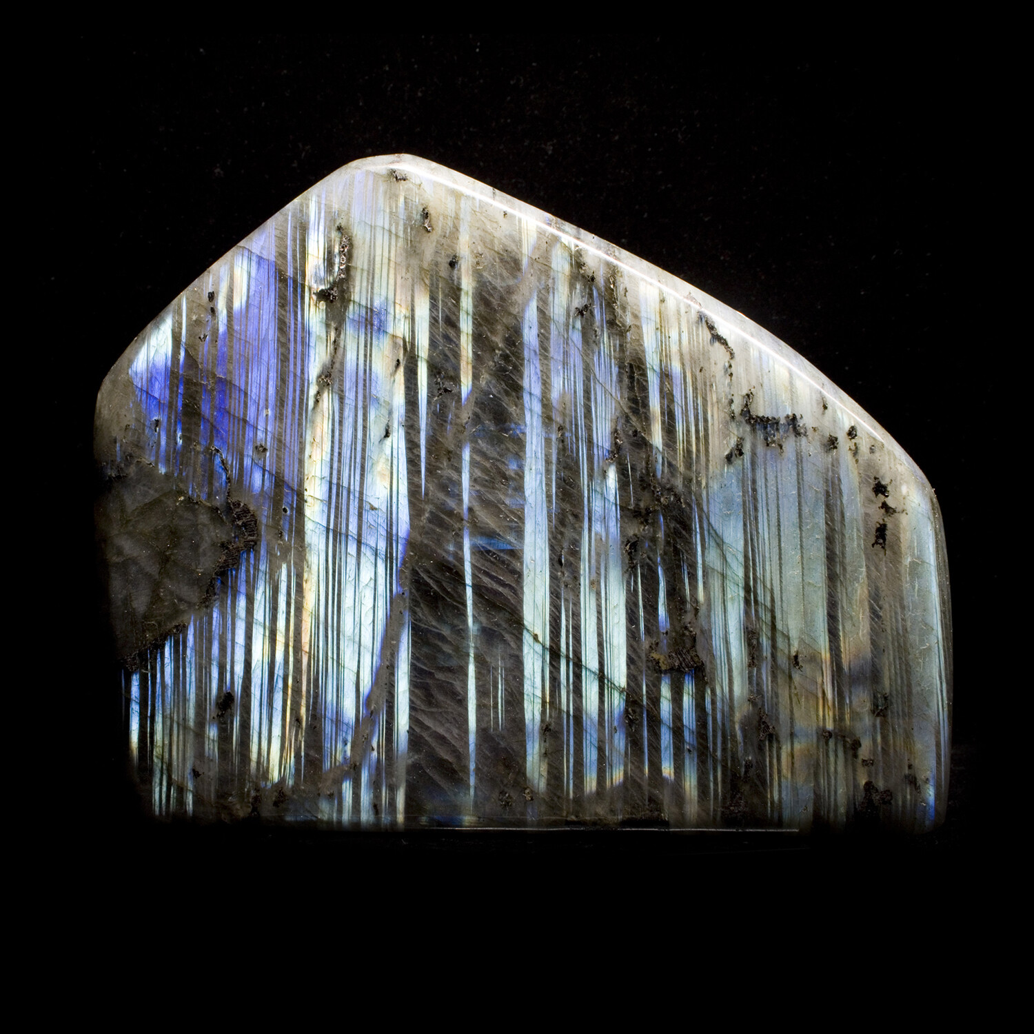Labradorite is a spectacularly iridescent mineral which exhibits different colors depending on the angle of the viewer. Artists polish freeform sculptures highlighting areas of maximum color. This uniquely aesthetic piece features strong color striping alternating with black. Labradorescence is not the superficial coloring of the stone, but a property of the light reflected by a surface within.