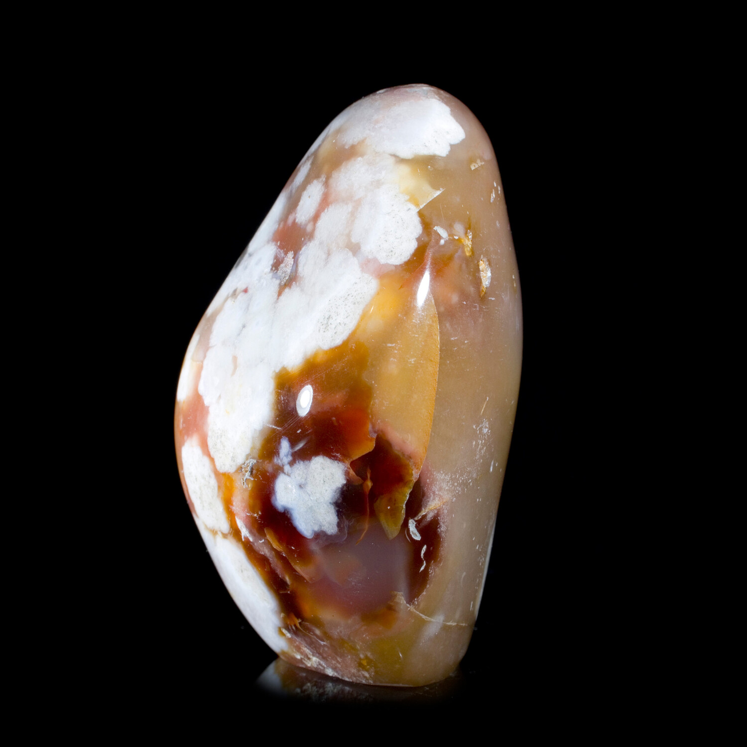Translucent polished freeform Flower Agate sculpture. Agate is a complex, layered form of Chalcedony and Quartz that has been worked by sculptors for thousands of years. Theophrastus, a ancient Greek naturalist, bestowed the name Agate upon this fascinating stone. The perfect windowsill piece or gift!